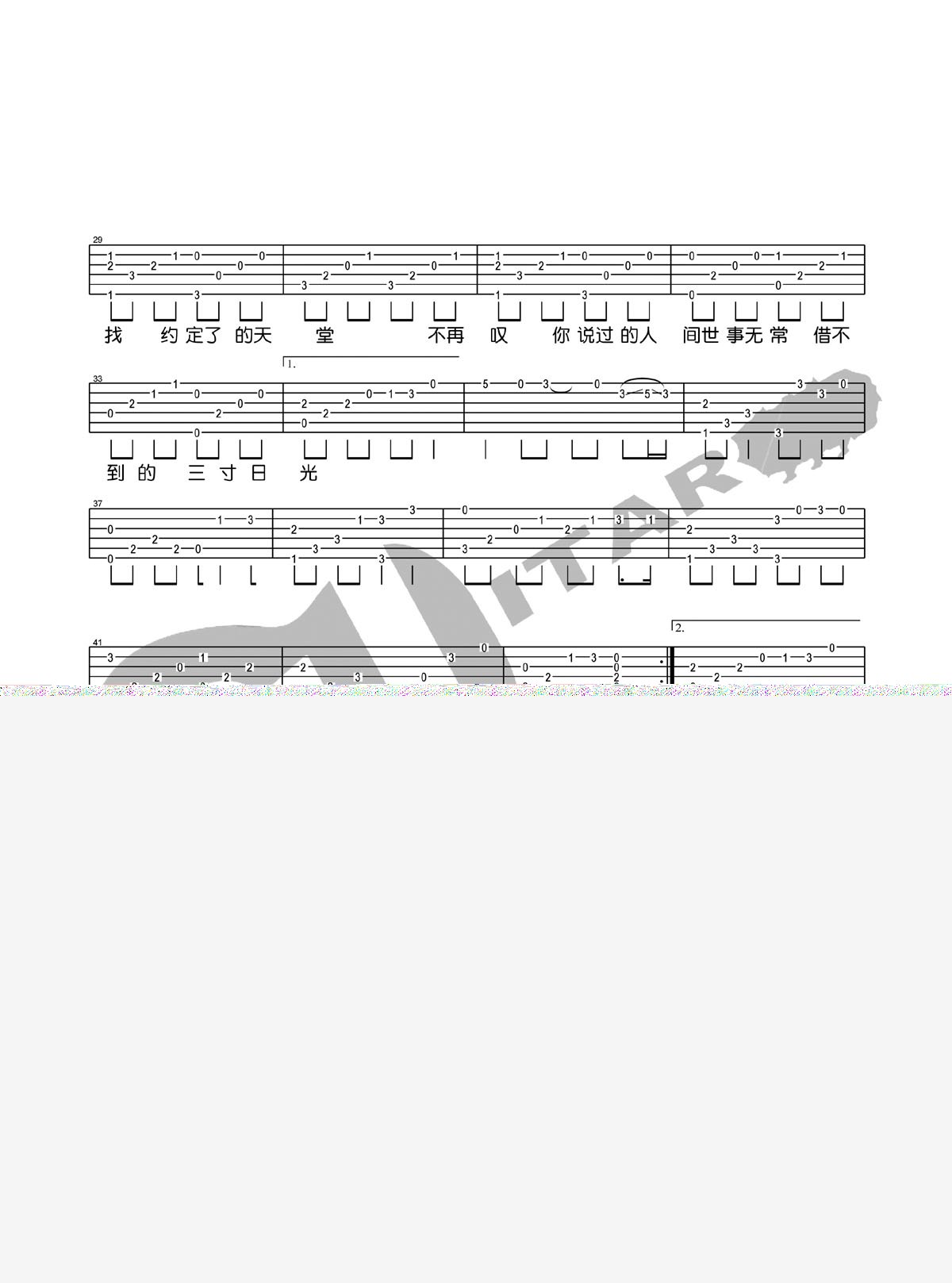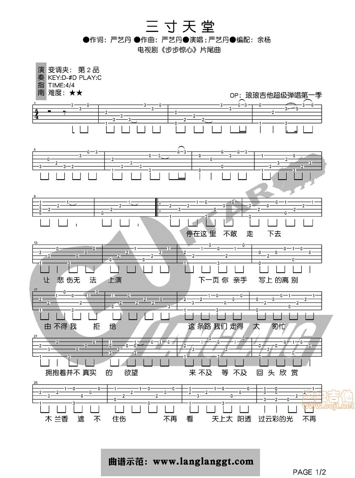 曲谱介绍: 三寸天堂|||严艺丹《【琅琅吉他】原版编配三寸天堂》吉他弹唱谱原版,共有2张高清图谱,免翻页排版设计。