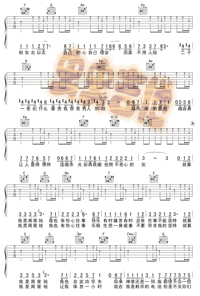 曲谱介绍: 《就算我是周星驰》吉他弹唱谱,共有3张高清图谱。