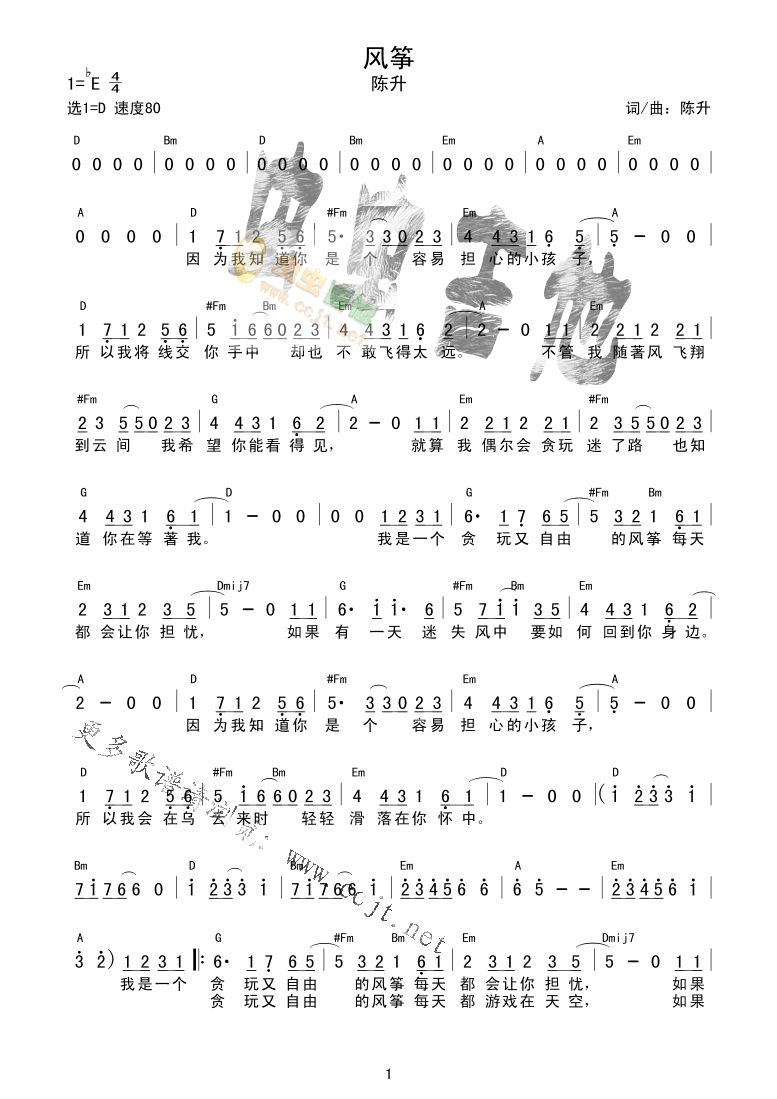 曲谱介绍: 《风筝》吉他弹唱谱,共有2张高清图谱,免翻页排版设计。