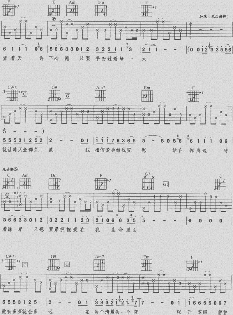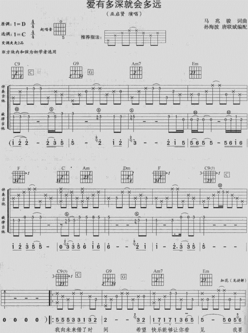 曲谱介绍: 《爱有多深就会多远》吉他弹唱谱,共有4张高清图谱。
