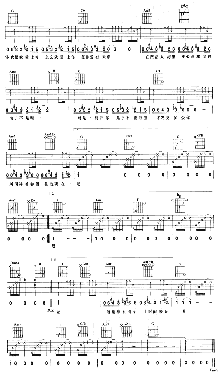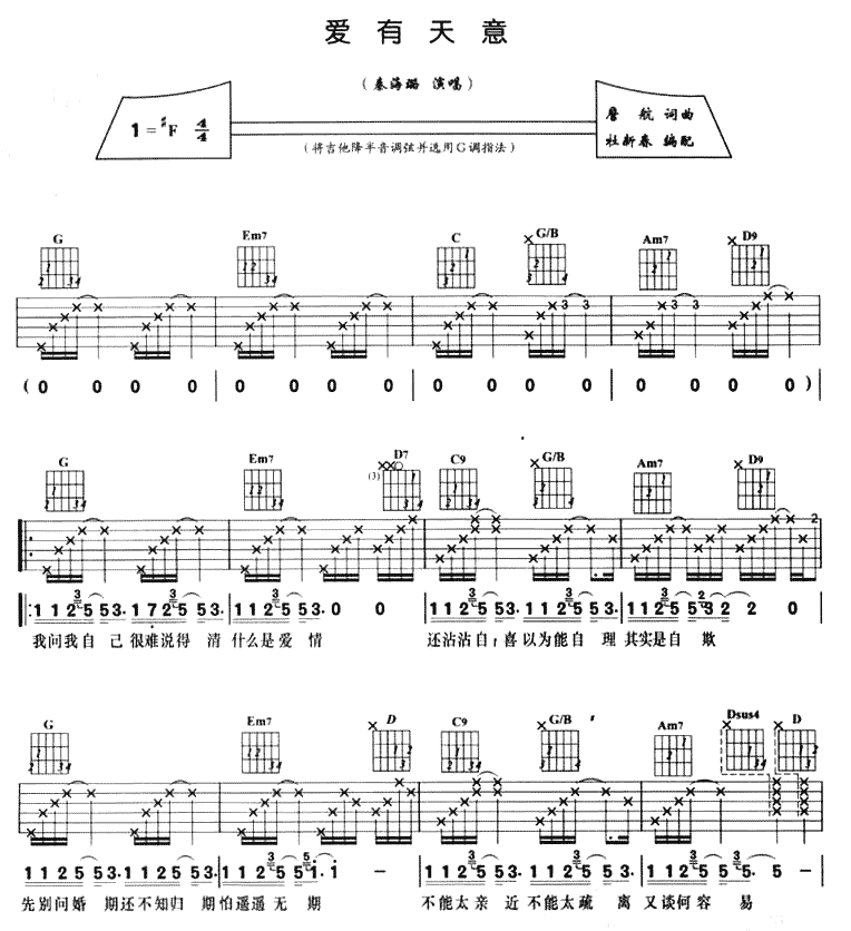 曲谱介绍: 《爱有天意》吉他弹唱谱,共有3张高清图谱。