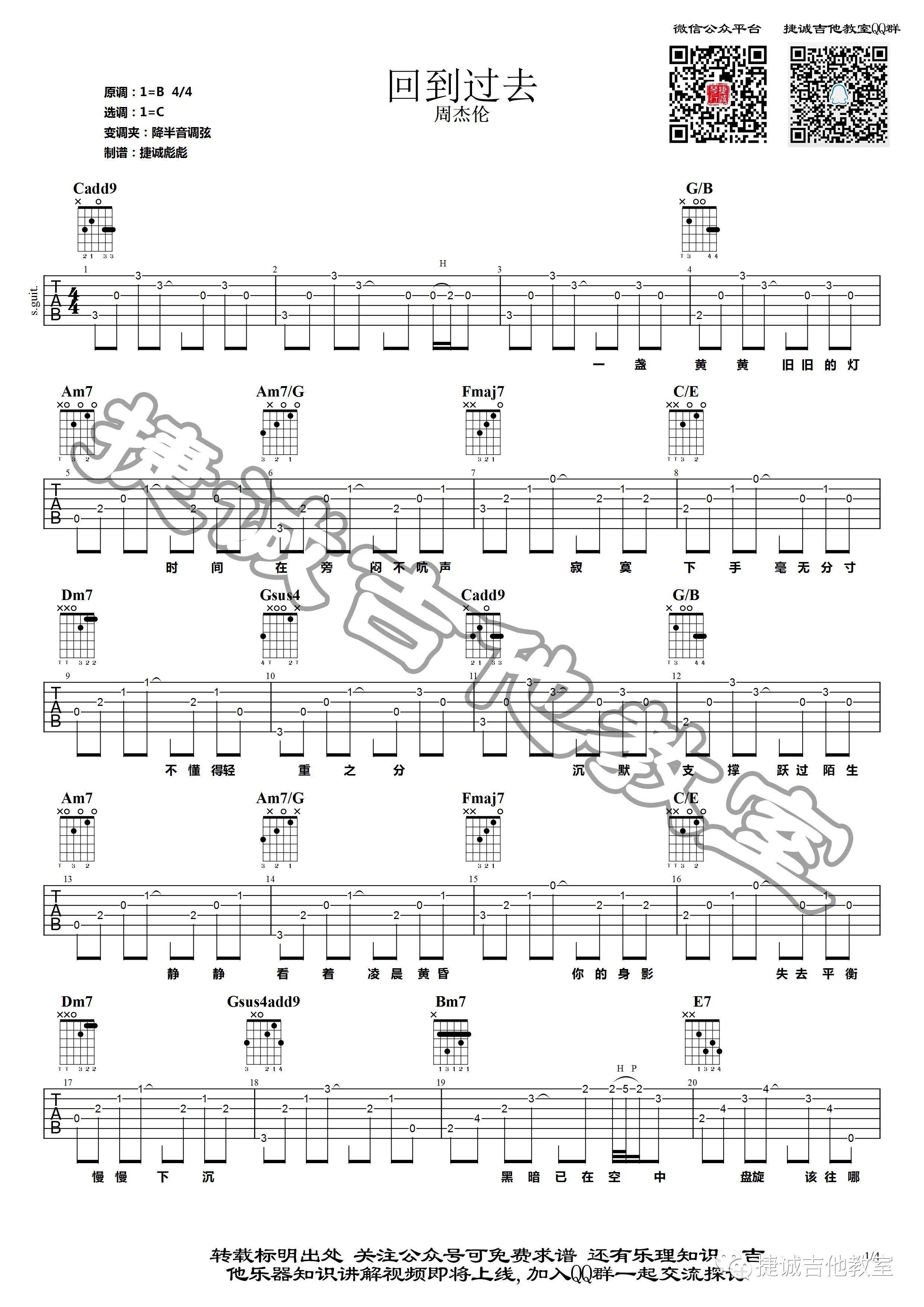 曲谱介绍: 吉他谱介绍:回到过去吉他谱,周杰伦演唱的一首歌曲,4/4拍的节奏,这首歌曲的原调为B调,这里曲谱采用了C调指法进行编配,演唱时降半音调弦可回到原调,也可根据个人实际嗓音情况选择不降音或夹几品。曲谱由琴谱网更新上传,共4张高清图片弹唱吉他谱例,来源于@捷诚吉他教室编配出品。很多美好的事物过去了,就不会再重来了,而很多美好的人过去了,就再也不会回到你身边了。周杰伦通过《回到过去》这首歌,表达了他那股难得可见的恋旧情绪,也想告诉大家好好珍惜那些美好的事物和人。