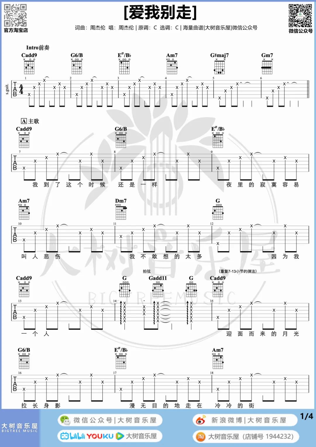 曲谱介绍: 吉他谱介绍:爱我别走吉他谱,周杰伦演唱的一首歌曲,4/4拍的节奏,这首歌曲的原调为C调,这里曲谱采用了C调指法进行编配,演唱时可不夹变调夹,曲谱由琴谱网更新上传,共5张高清图片弹唱吉他谱例,来源于@大树音乐屋编配出品。这首歌原唱为张震岳,也是张震岳创作,一首不算老的老歌,却被众多知名歌手翻唱过,杰伦也翻唱过这首经典的歌曲。 爱我别走吉他弹唱教学