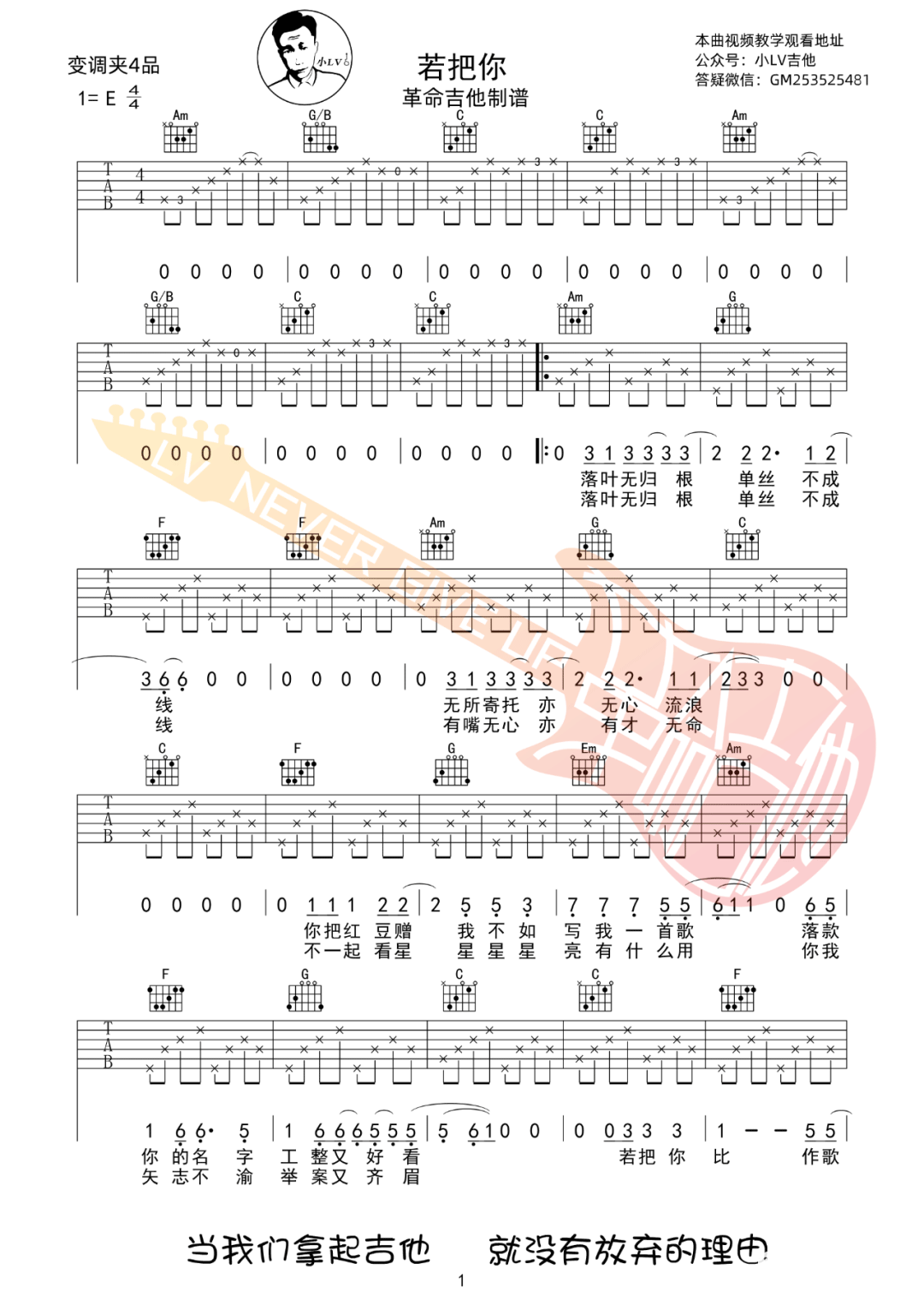 曲谱介绍: 吉他谱介绍:若把你吉他谱,刘瑾睿演唱的一首歌曲,4/4拍的节奏,这首歌曲的原调为E调,这里曲谱采用了C调指法进行编配,演唱时夹变调夹4品可回到原调,也可根据个人实际嗓音情况选择。曲谱由琴谱网更新上传,共2张高清图片弹唱吉他谱例,来源于@革命吉他编配出品。“若把你比作歌,你便是那高山流水,恒顺众生,绝弦的美。”每个辗转反侧的夜晚,每个缠绵悱恻的瞬间,交织在一起,编织成了青春最美的天空。 若把你吉他弹唱教学