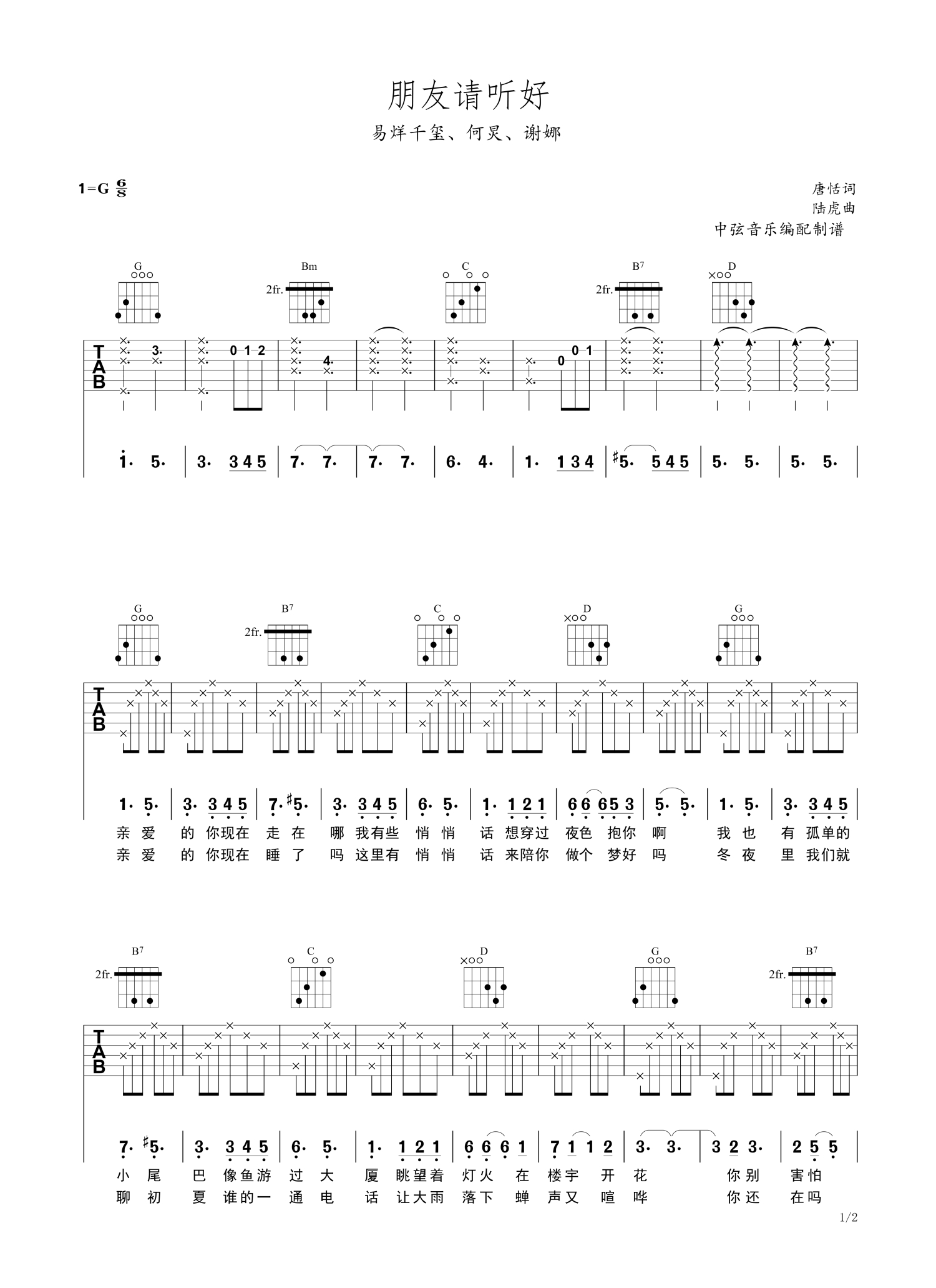 • 朋友请听好吉他谱 - 何炅/易烊千玺/谢娜 - G调吉他弹唱谱第1张