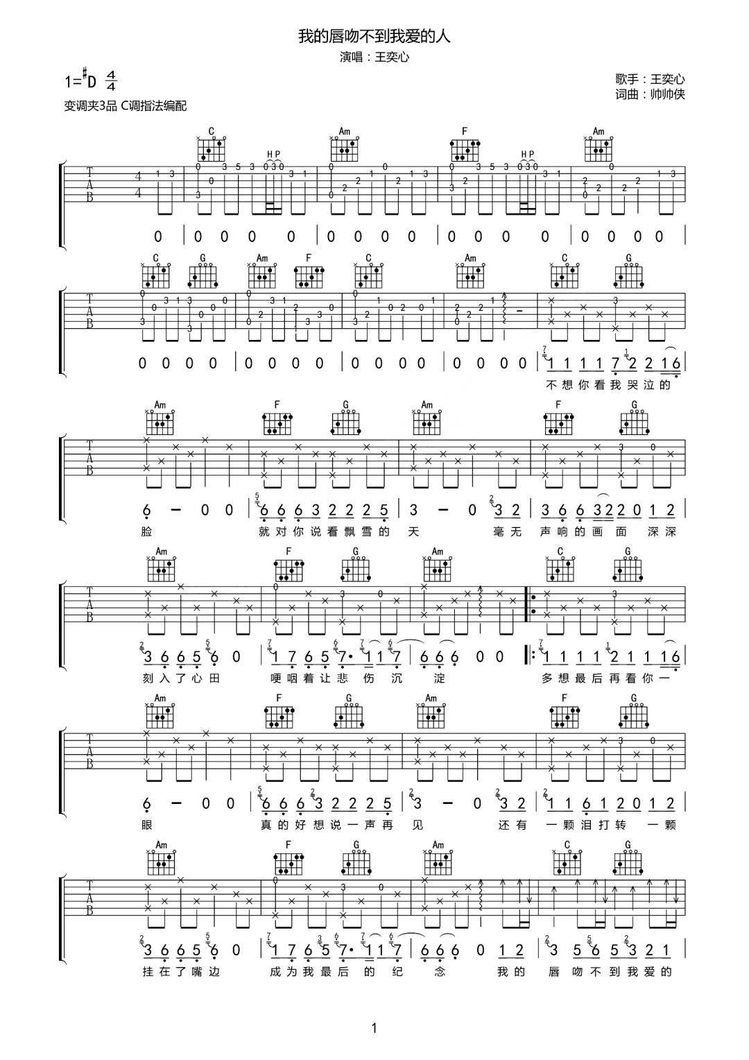 曲谱介绍: 吉他谱介绍:我的唇吻不到我爱的人吉他谱,王奕心演唱的一首歌曲,4/4拍的节奏,这首歌曲的原调为降E调,这里曲谱采用了C调指法进行编配,演唱时夹变调夹3品可回到原调,也可根据个人实际嗓音情况选择。曲谱由琴谱网更新上传,共2张高清图片弹唱吉他谱例,曲谱来源于网络转载,编配制谱者暂不详。这首歌的轻柔旋律,歌词戳心,王奕心的嗓音充满画面感,副歌那句“我的唇吻不到我爱的人”让人虐心、不禁落泪。