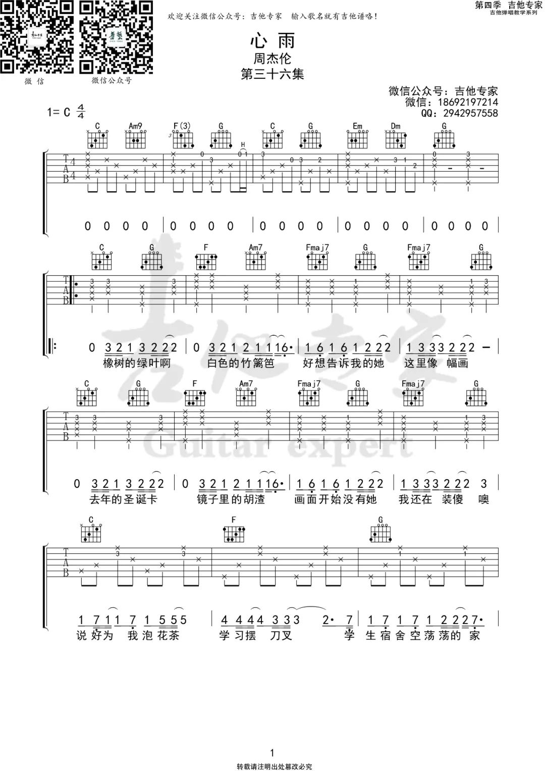 心雨吉他谱 - 周杰伦 - C调吉他弹唱谱 - 原版