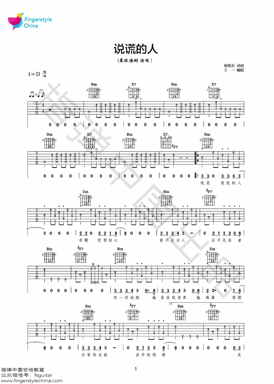 曲谱介绍: 吉他谱介绍:说谎的人吉他谱,星球撞树演唱的一首歌曲,4/4拍的节奏,这首歌曲的原调为D调,这里曲谱采用了D调指法进行编配,演唱时可不夹变调夹,曲谱由琴谱网更新上传,共4张高清图片弹唱吉他谱例,来源于@王一编配出品。在每一个热闹的场合,总是扮演着那个让气氛冷掉的人。很多时候,你看重的那些感情,最后,总是弱不禁风。这首歌会让你在很多节奏里找到自己的影子,毕竟,我们都是那个说谎的人。