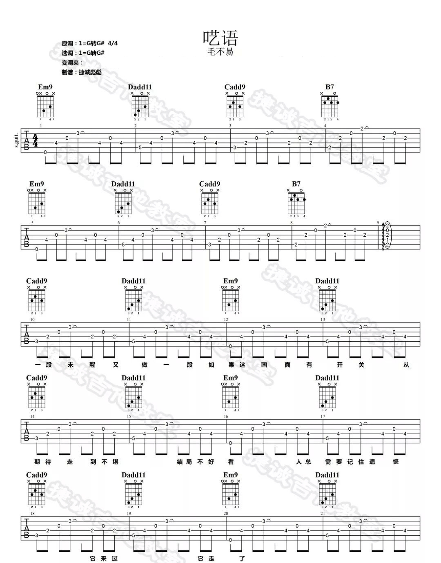 呓语吉他谱 - 毛不易 - G调吉他弹唱谱
