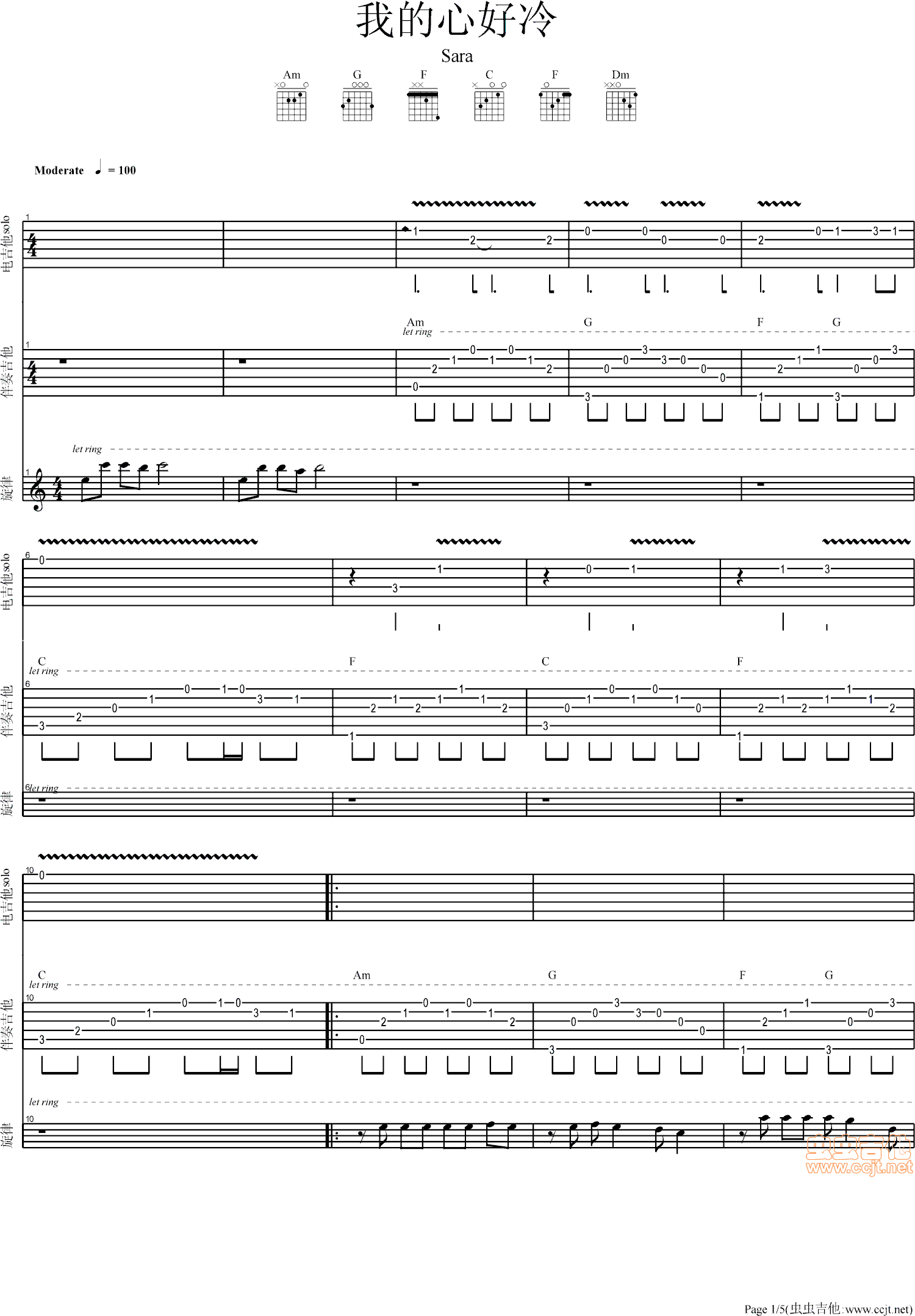 曲谱介绍: 《我的心好冷C调完美版》吉他弹唱谱,采用C调指法编配,共有5张高清图谱。