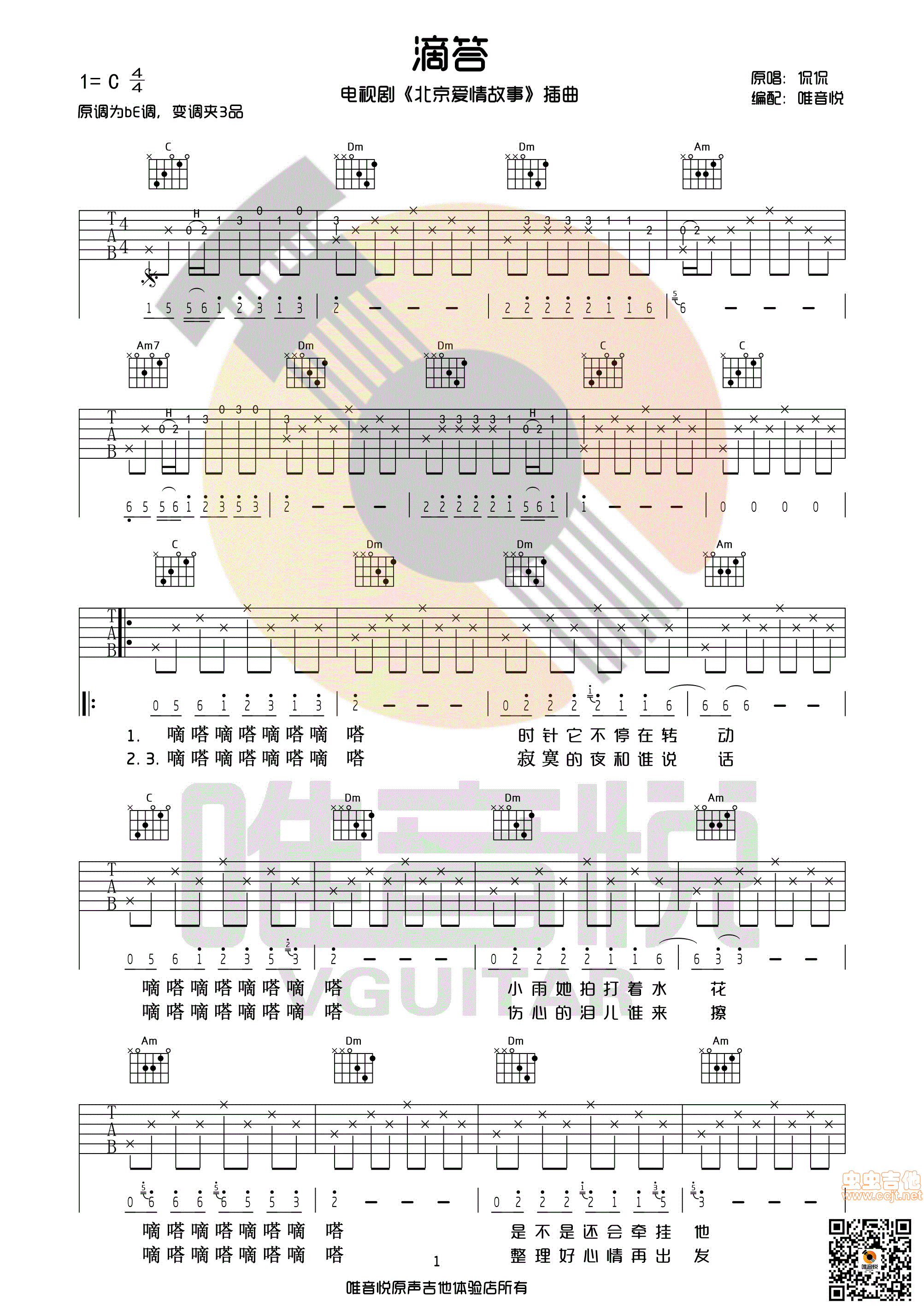 滴答 嘀嗒 侃侃 北京爱情故事主题曲 唯音悦制吉他谱 - 滴答 - C调吉他弹唱谱 - 原版