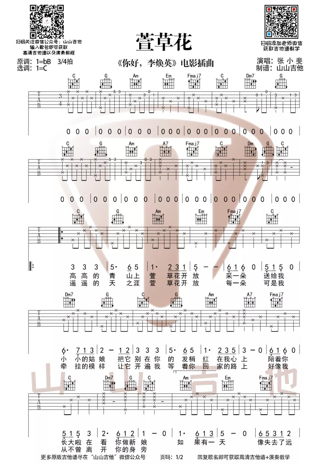 曲谱介绍: 张小斐《萱草花》吉他弹唱谱,采用C调指法编配,共有2张高清图谱,免翻页排版设计。
