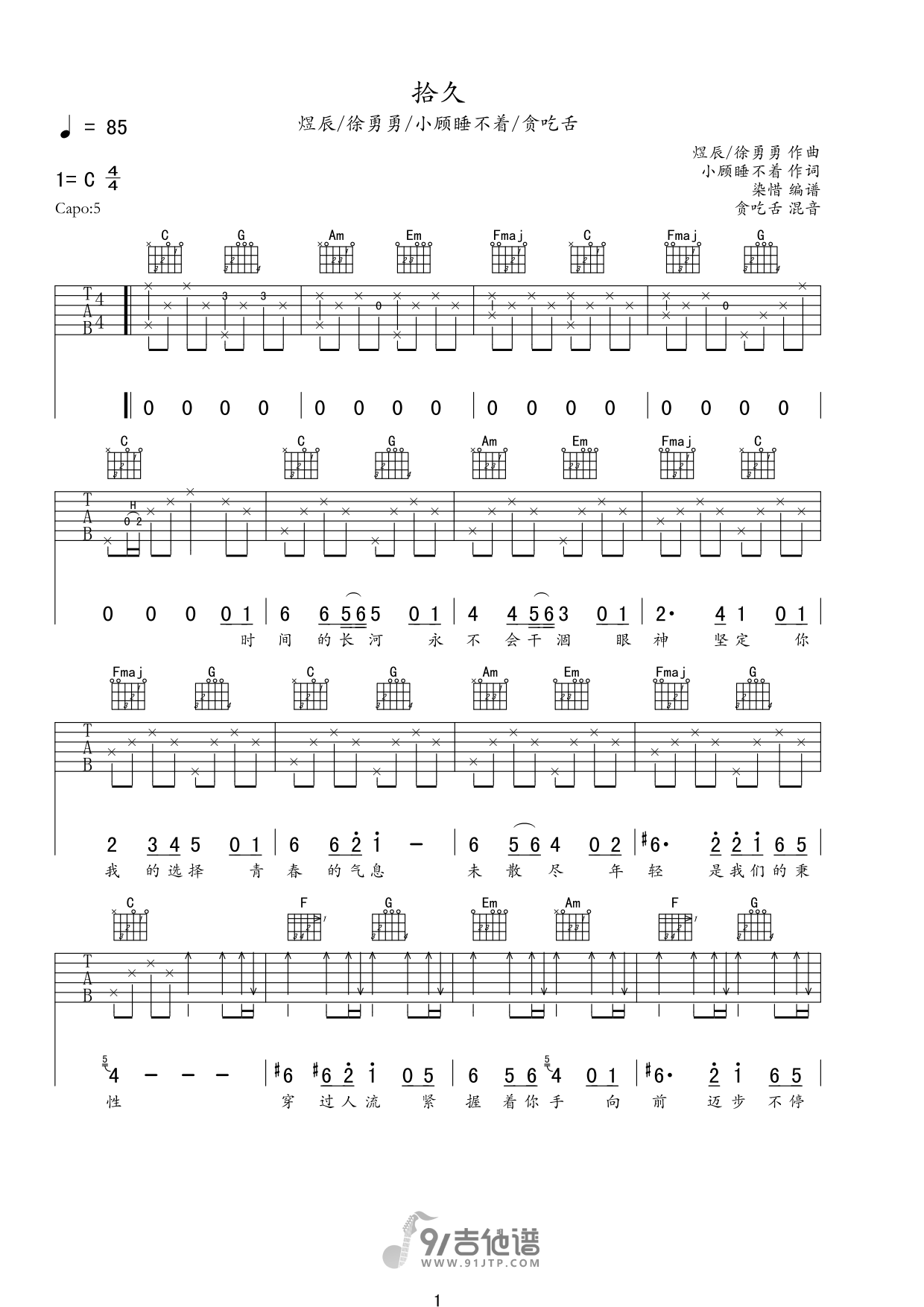 曲谱介绍: 歌曲:《拾久》吉他弹唱谱 歌手:煜辰 / 徐勇勇 / 小顾睡不着 / 贪吃舌 变调夹:5品