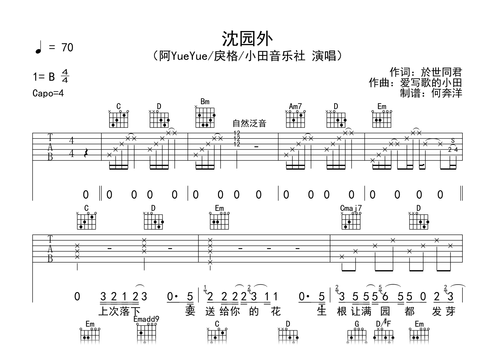 曲谱介绍: 沈园外吉他谱,阿YueYue/戾格/小田音乐社演唱的一首古风歌曲,《沁园外》吉他弹唱谱,原调B,变调夹Capo4品,选用G调和弦指法编配,前奏部分自然泛音处需多加练习,完整版共三张高清图片谱。