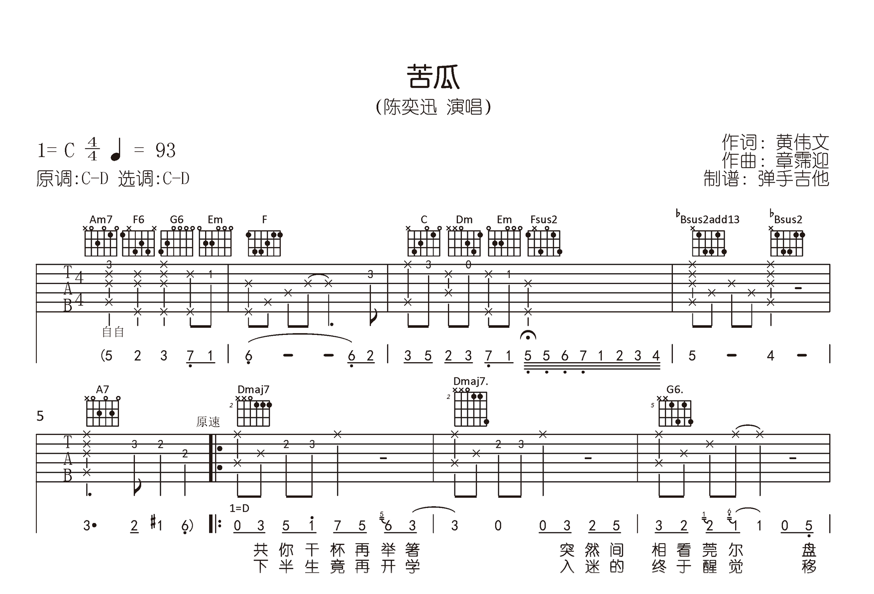 曲谱介绍: 苦瓜吉他谱,陈奕迅粤语经典歌曲,以半生瓜来比喻人生,探讨人心起落。《苦瓜》吉他弹唱谱,选用原调C-D调,演奏速度大约每分钟93拍,精编六线谱推荐。