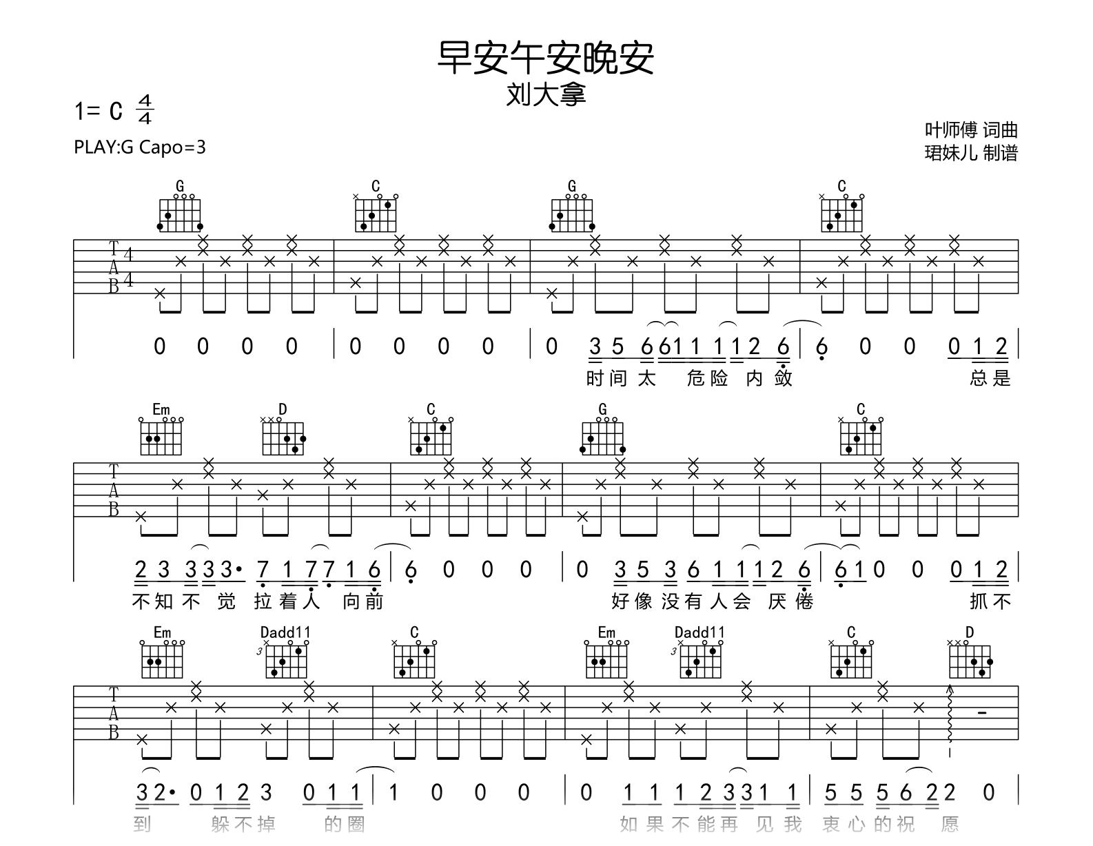 曲谱介绍: 早安午安晚安吉他谱,治愈系歌手刘大拿新歌。《早安午安晚安》吉他弹唱谱,原调C,采用G调指法编配,建议变调夹3品,速度85BPM,演奏难度较简单易上手。