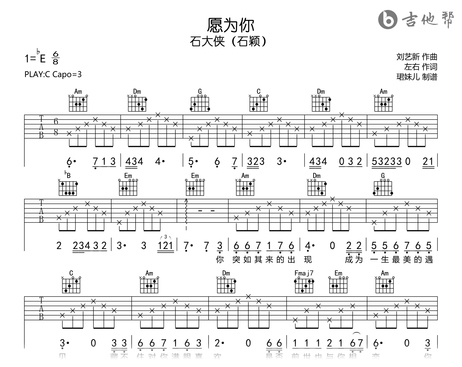 曲谱介绍: 愿为你吉他谱,石大侠(石颖)演唱的一首网络爆红歌曲,清新的曲调,优美的歌词,深情地讲述了一个动人的故事。你突如其来的出现,成为一生最美的遇见。藏不住对你满眼喜欢,是否前世也与你相恋。 《愿为你》吉他弹唱谱,原调bE调,采用C调指法编配,建议变调夹3品,速度85BPM演奏较简单难度易上手。