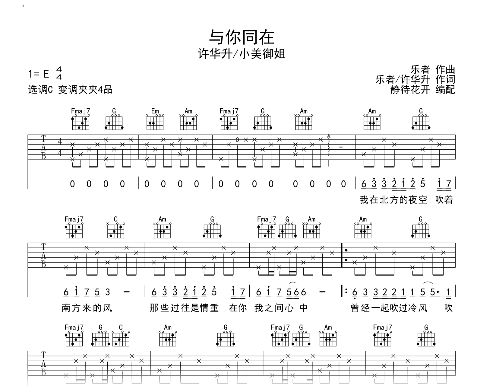 曲谱介绍: 与你同在吉他谱,许华升/小美御姐演唱,《与你同在》吉他弹唱谱,编配制作选用C调和弦指法,原调E调,推荐变调夹夹4品,琴友们也可根据个人情况选择变调夹,适合自己音高即可,演奏速度每分钟86拍,整体难度简单。