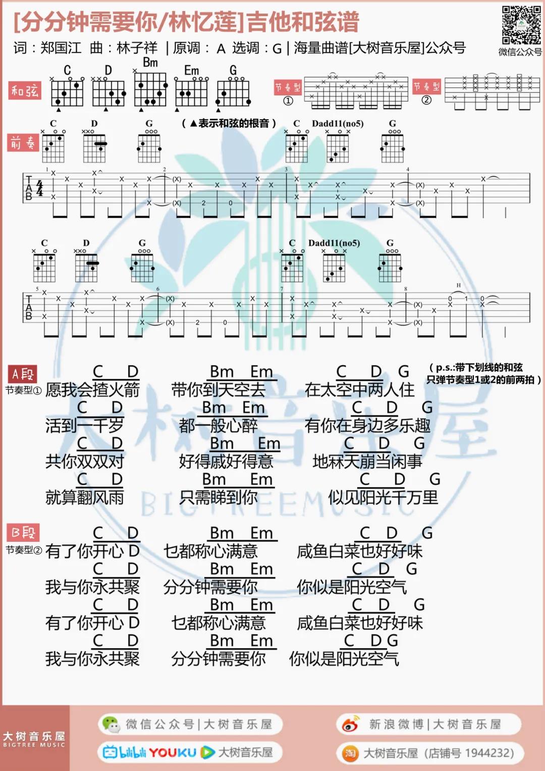 曲谱介绍: 林子祥,林忆莲《分分钟需要你》吉他弹唱谱,采用G调指法编配,共有3张高清图谱。