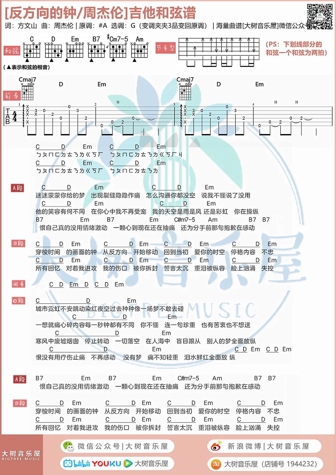 曲谱介绍: 周杰伦《反方向的钟》吉他弹唱谱,采用G调指法编配,共有4张高清图谱。