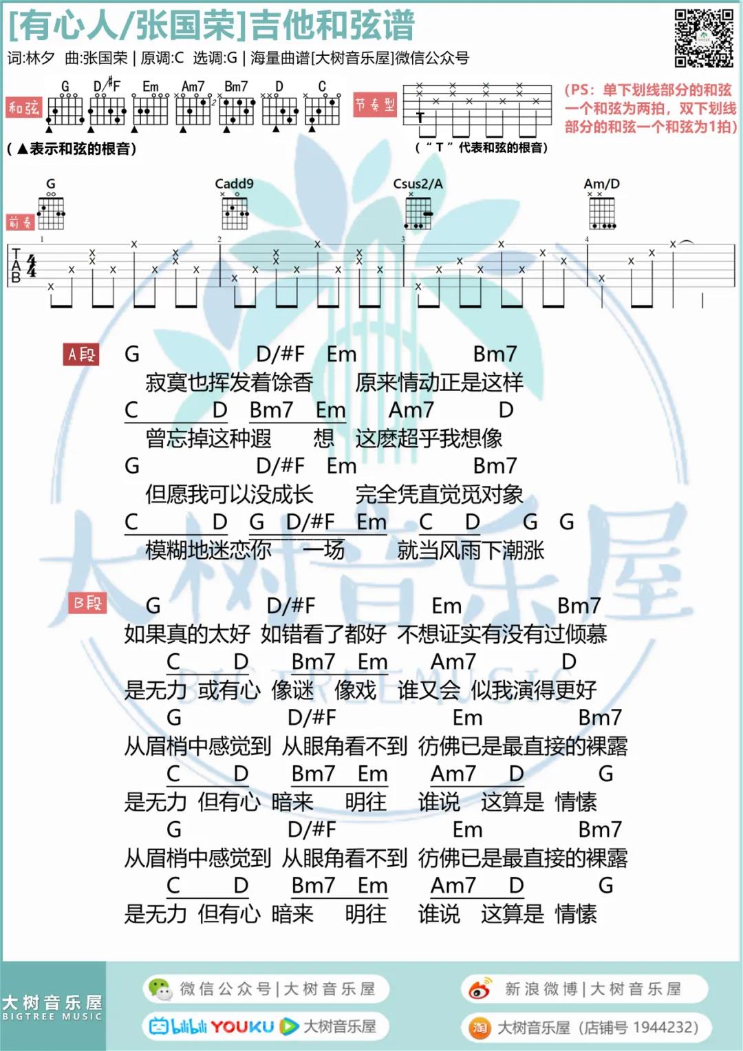 曲谱介绍: 张国荣《有心人》吉他弹唱谱,采用G调指法编配,共有3张高清图谱。