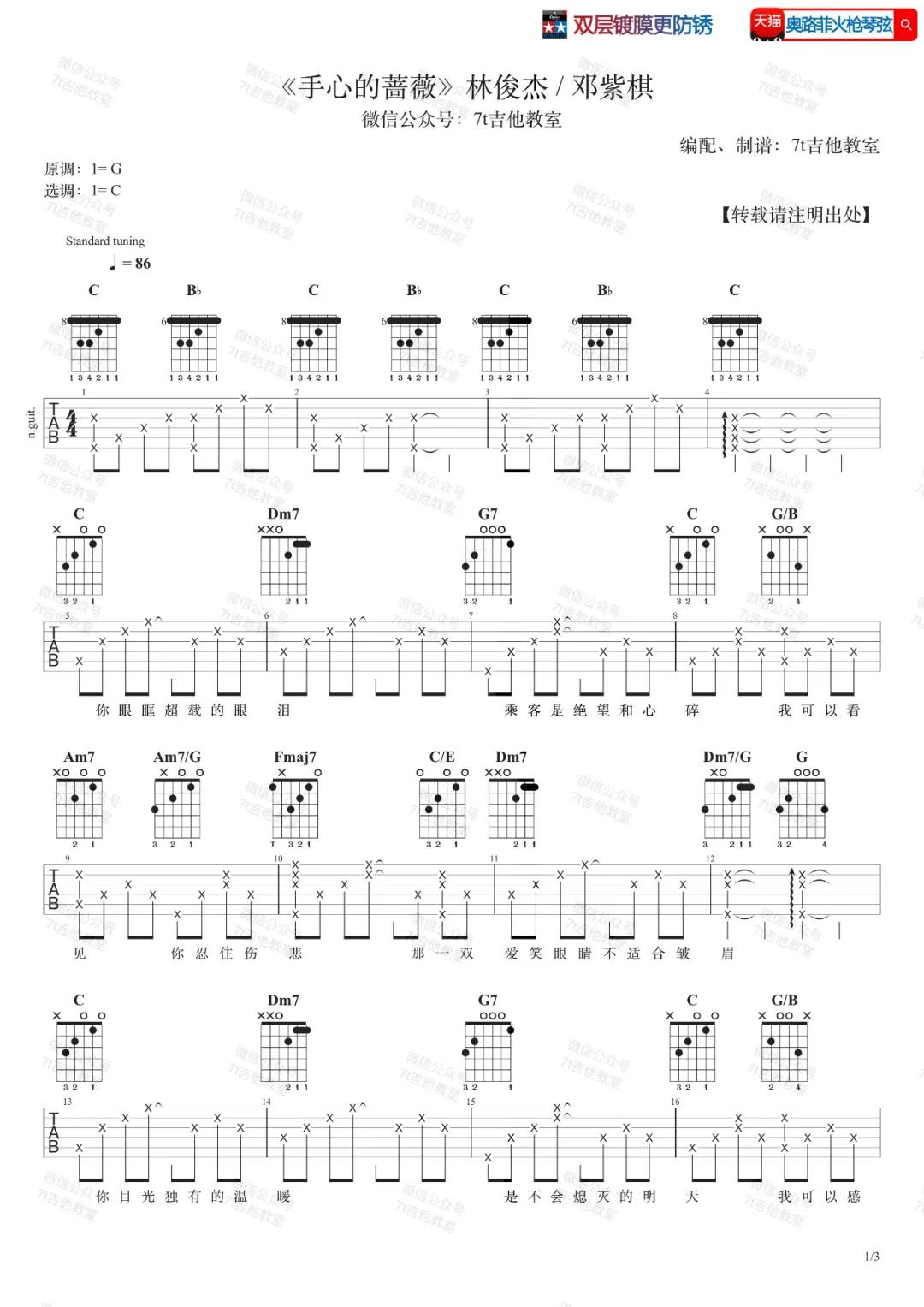曲谱介绍: 林俊杰,邓紫棋《手心的蔷薇》吉他弹唱谱,采用C调指法编配,共有3张高清图谱。
