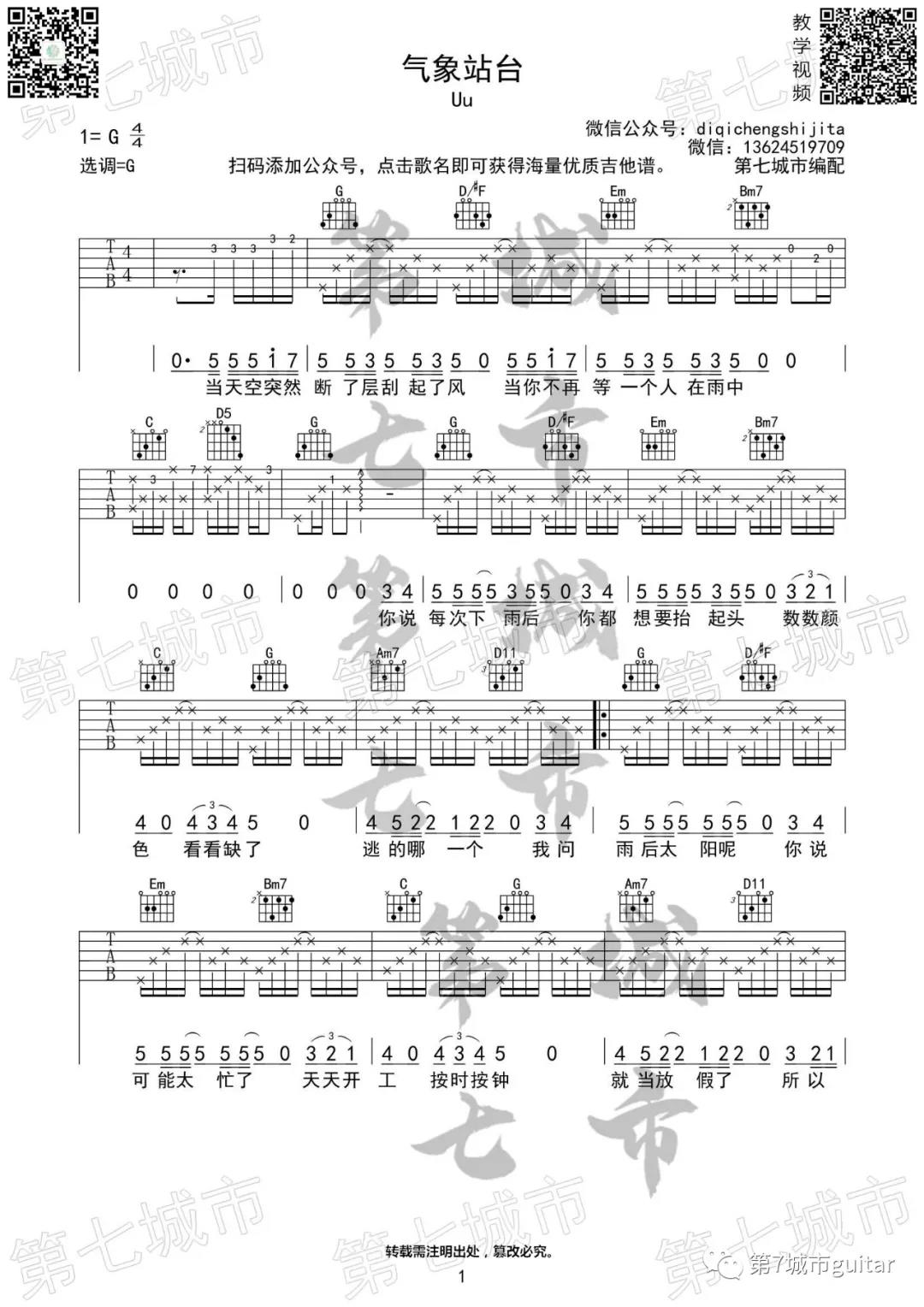 曲谱介绍: Uu《气象站台》吉他弹唱谱,采用G调指法编配,共有3张高清图谱。