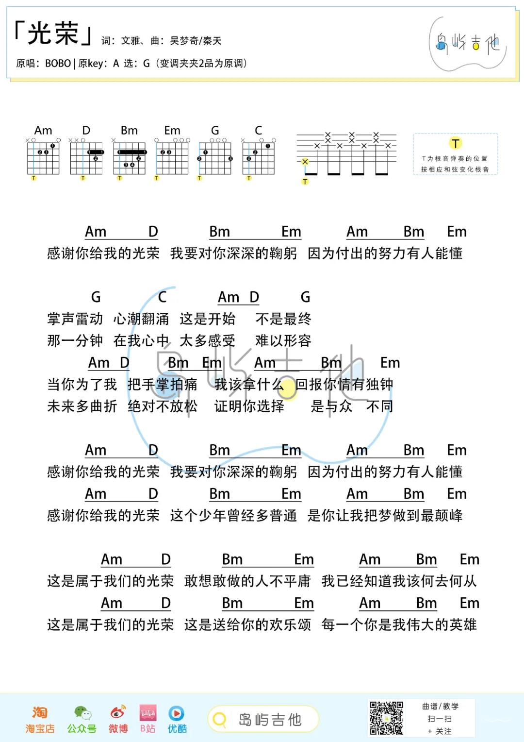 曲谱介绍: BOBO《光荣》吉他弹唱谱,采用G调指法编配,共有1张高清图谱,免翻页排版设计。