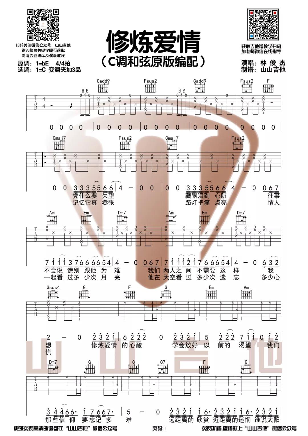 曲谱介绍: 林俊杰《修炼爱情》吉他弹唱谱,采用C调指法编配,共有3张高清图谱。