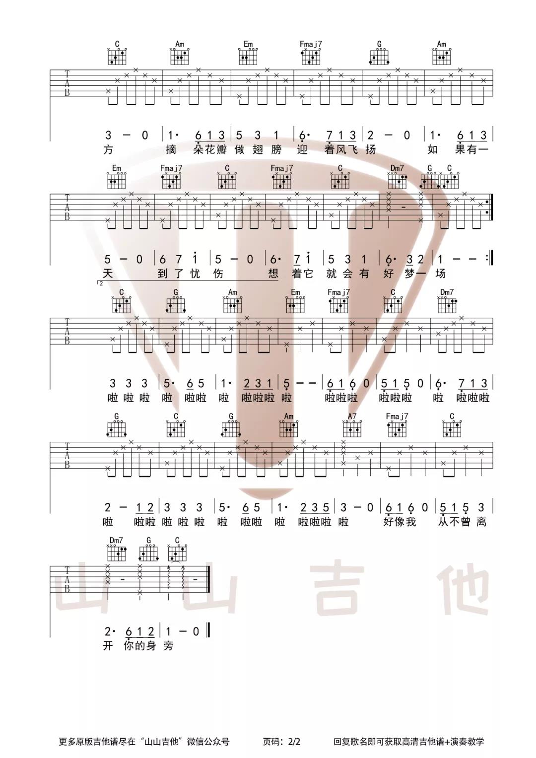 曲谱介绍: 张小斐《萱草花》吉他弹唱谱,采用C调指法编配,共有2张高清图谱,免翻页排版设计。