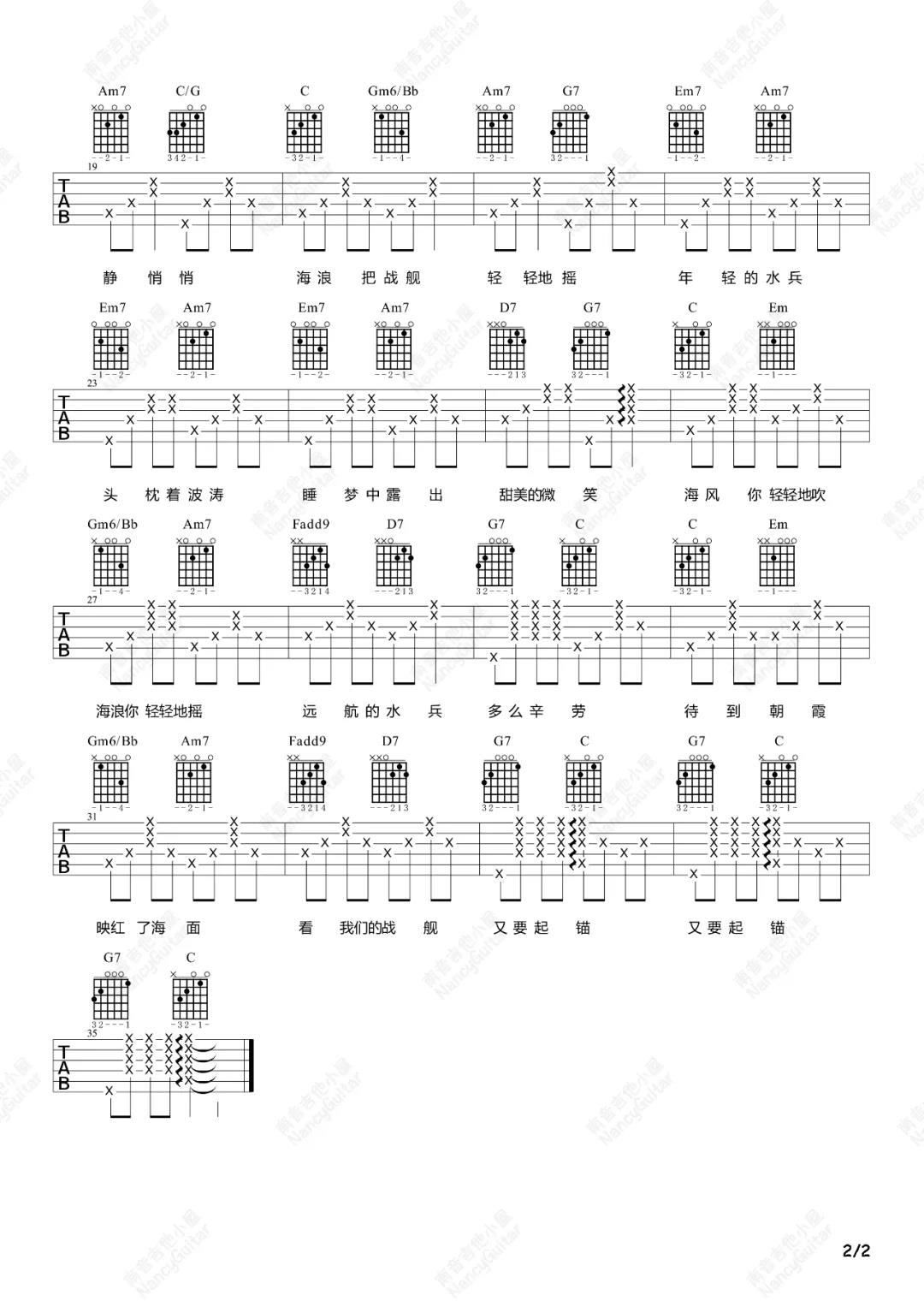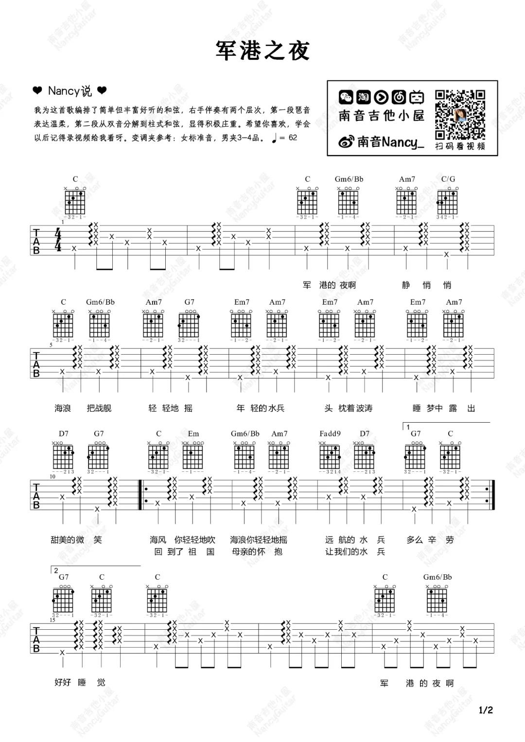 曲谱介绍: 苏小明《军港之夜》吉他弹唱谱,采用C调指法编配,共有2张高清图谱,免翻页排版设计。