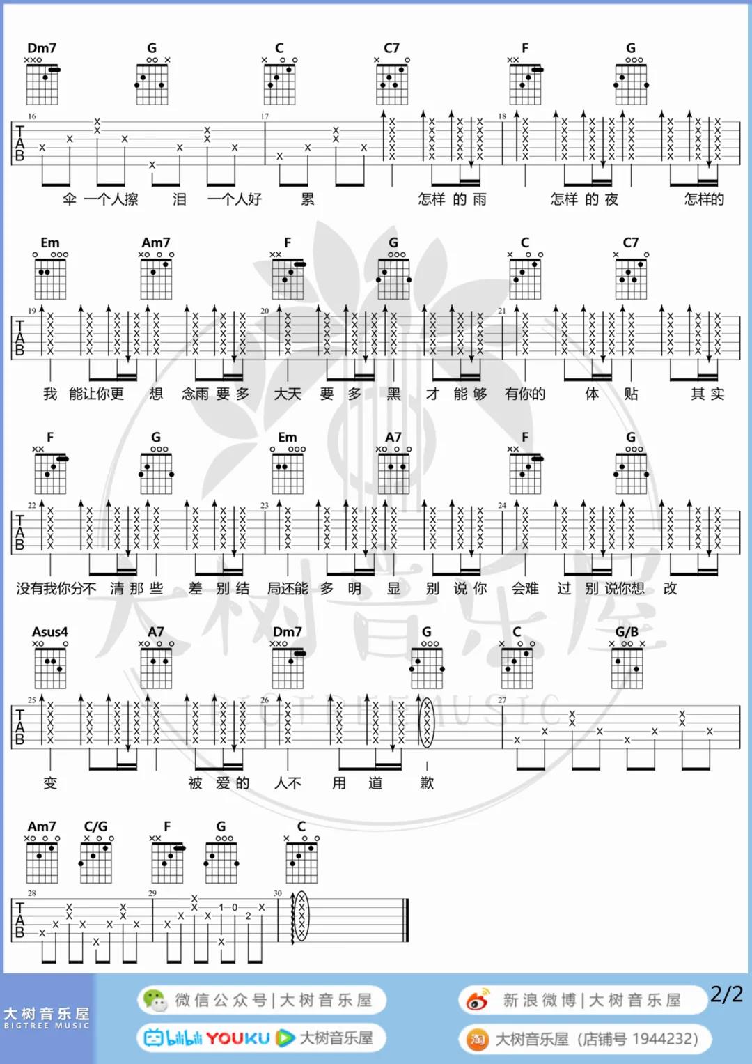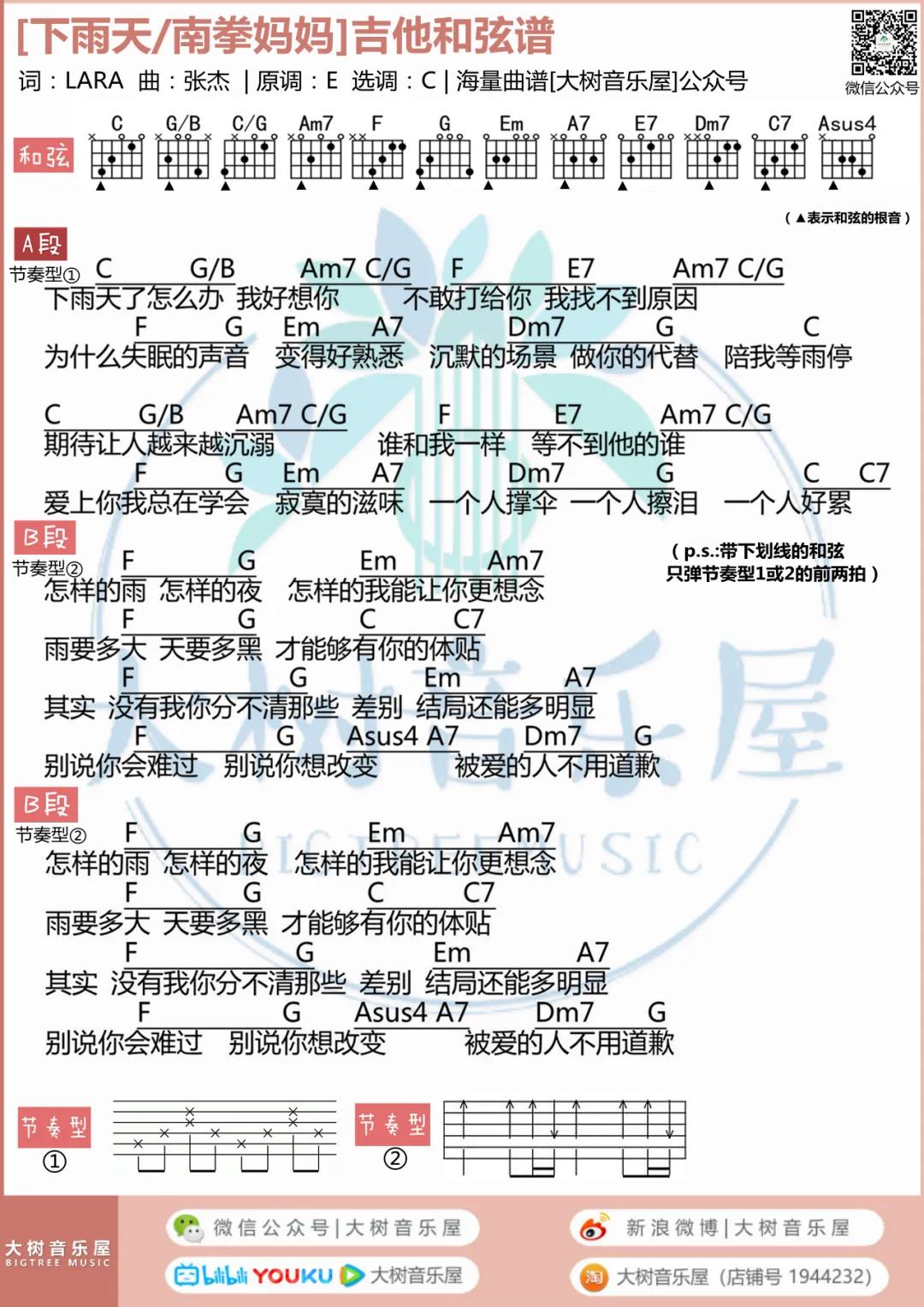 曲谱介绍: 南拳妈妈,梁心颐《下雨天》吉他弹唱谱,采用C调指法编配,共有3张高清图谱。