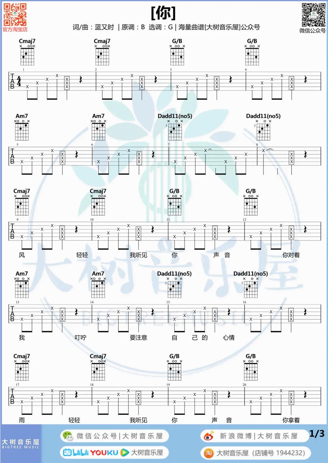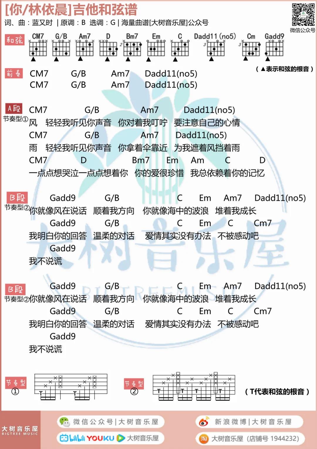 曲谱介绍: 林依晨《你》吉他弹唱谱,采用G调指法编配,共有4张高清图谱。