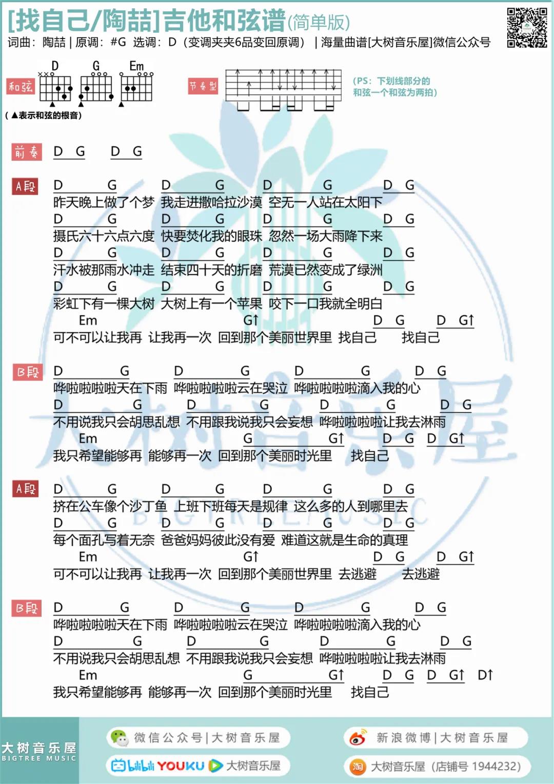曲谱介绍: 陶喆《找自己》吉他弹唱谱,采用G调指法编配,共有1张高清图谱,免翻页排版设计。