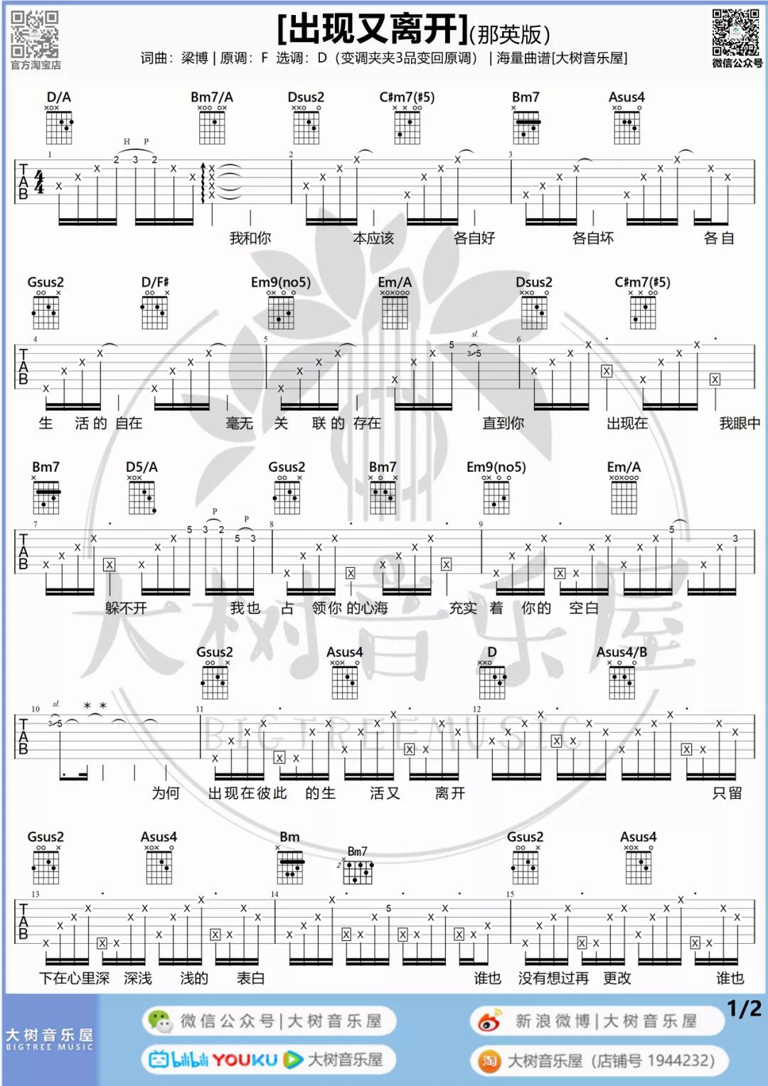 曲谱介绍: 那英《出现又离开》吉他弹唱谱,采用G调指法编配,共有3张高清图谱。