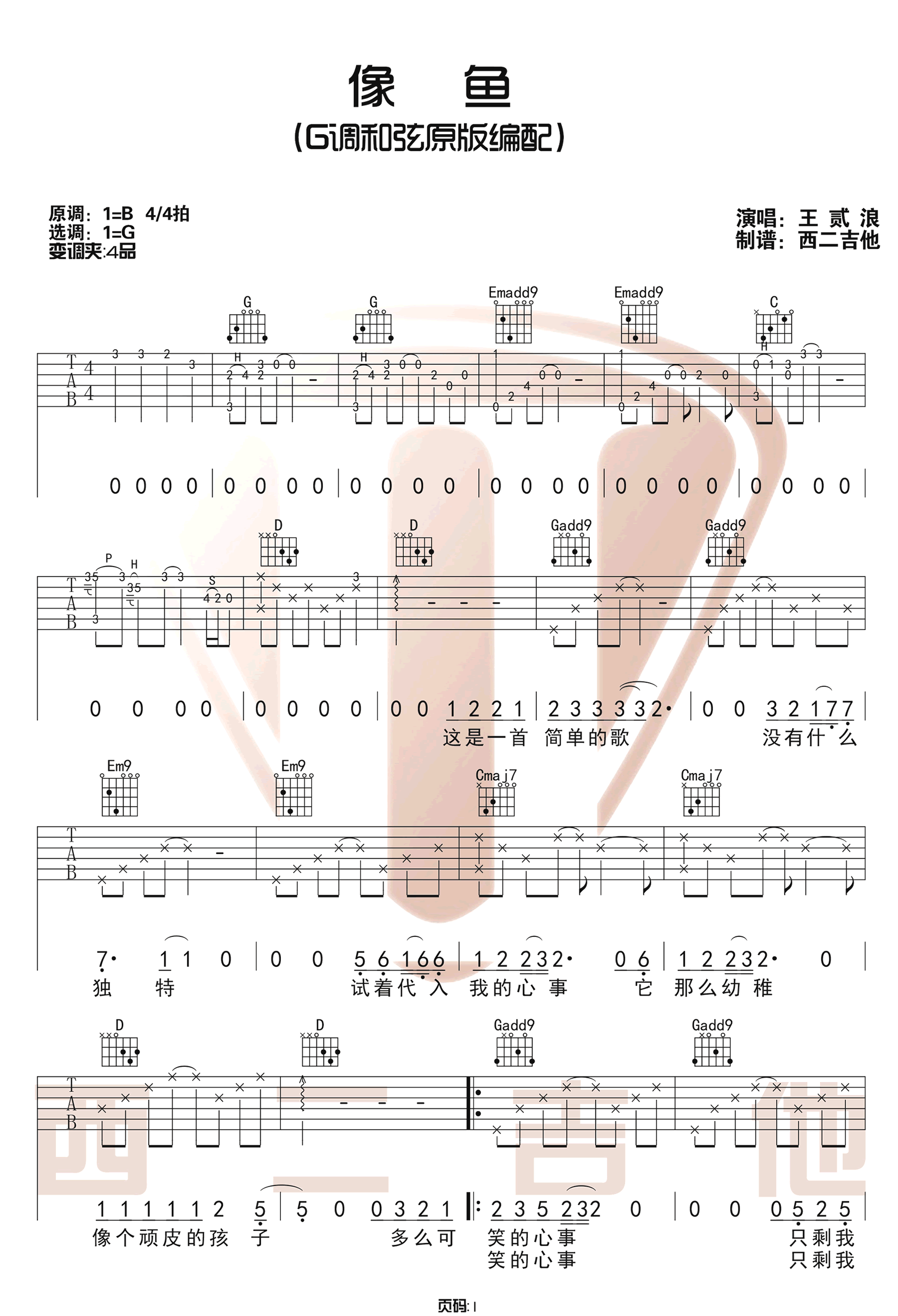 像鱼吉他谱 - 王贰浪 - G调吉他弹唱谱 - 原版
