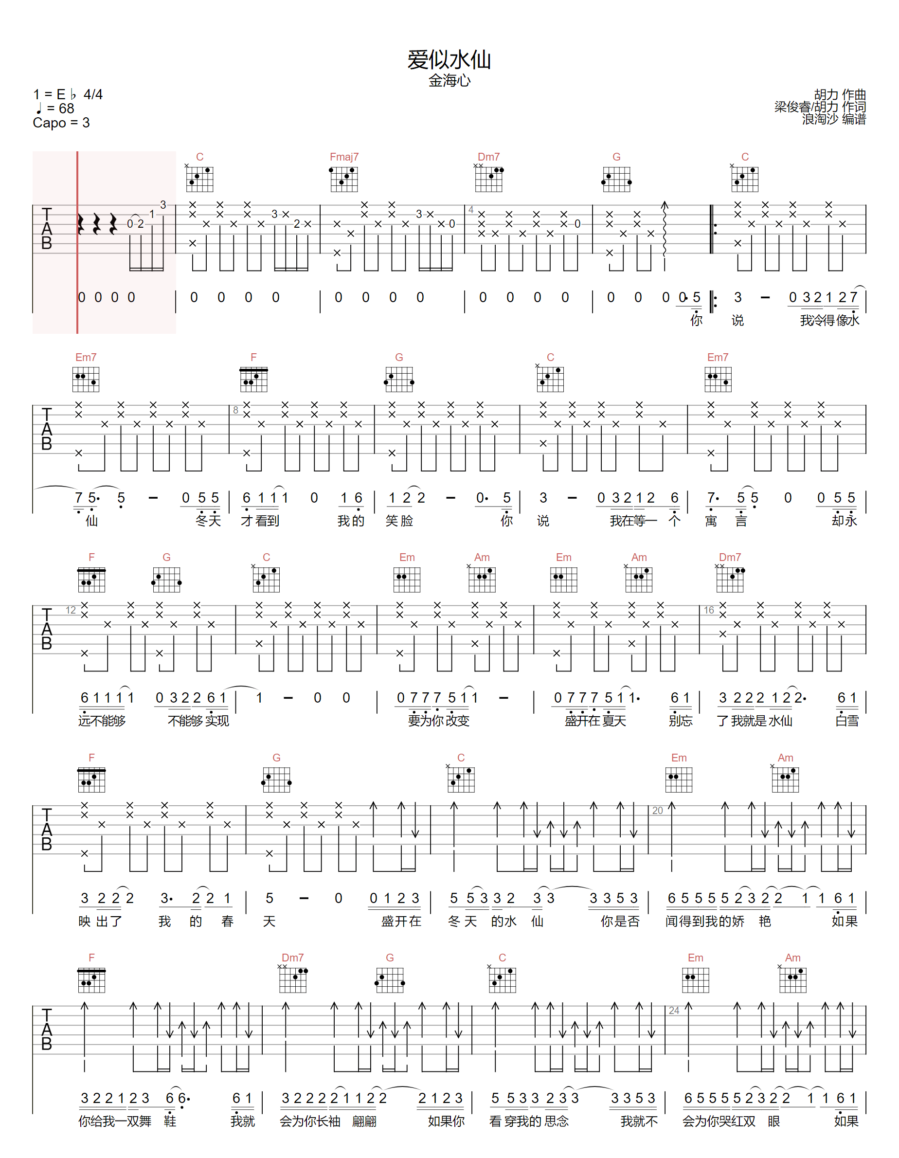 爱似水仙吉他谱 - 金海心 - C调吉他弹唱谱 - 原版