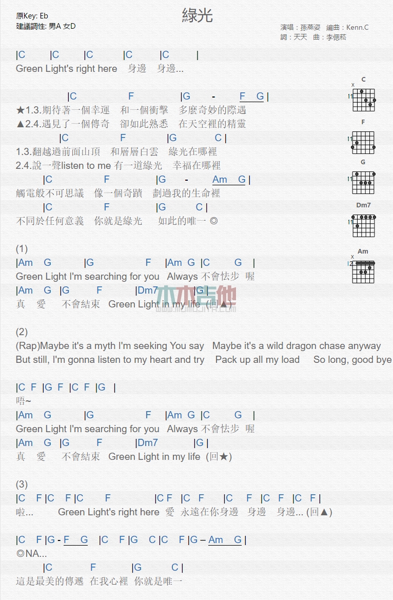 绿光吉他谱 - 孙燕姿 - 吉他弹唱谱
