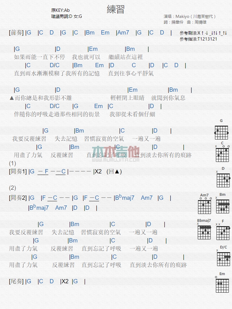 曲谱介绍: 川岛茉树代《练习》吉他弹唱谱,共有1张高清图谱,免翻页排版设计。