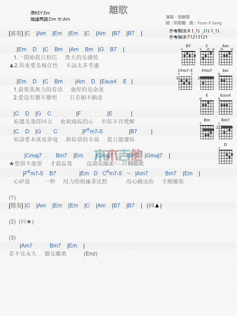 曲谱介绍: 信乐团《离歌》吉他弹唱谱,共有1张高清图谱,免翻页排版设计。