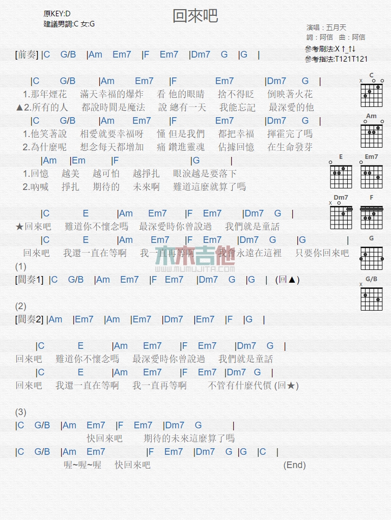 曲谱介绍: 五月天《回来吧》吉他弹唱谱,共有1张高清图谱,免翻页排版设计。