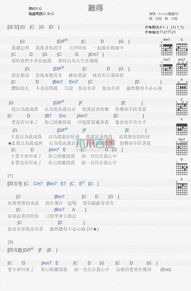 曲谱介绍: 黄丽玲《难得》吉他弹唱谱,共有1张高清图谱,免翻页排版设计。