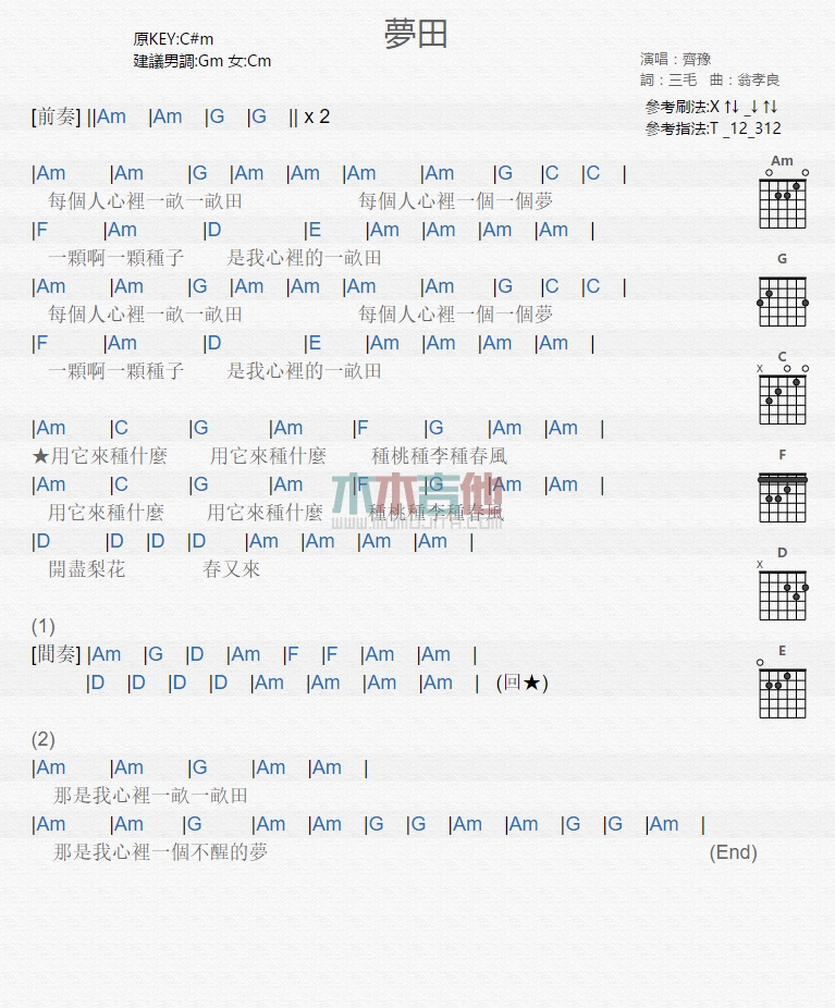 曲谱介绍: 齐豫《梦田》吉他弹唱谱,共有1张高清图谱,免翻页排版设计。