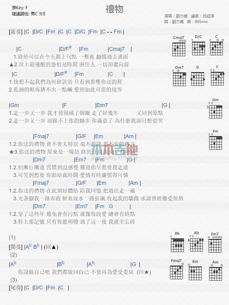 曲谱介绍: 刘力扬《礼物》吉他弹唱谱,共有1张高清图谱,免翻页排版设计。