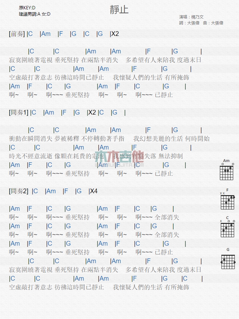 曲谱介绍: 杨乃文《静止》吉他弹唱谱,共有1张高清图谱,免翻页排版设计。