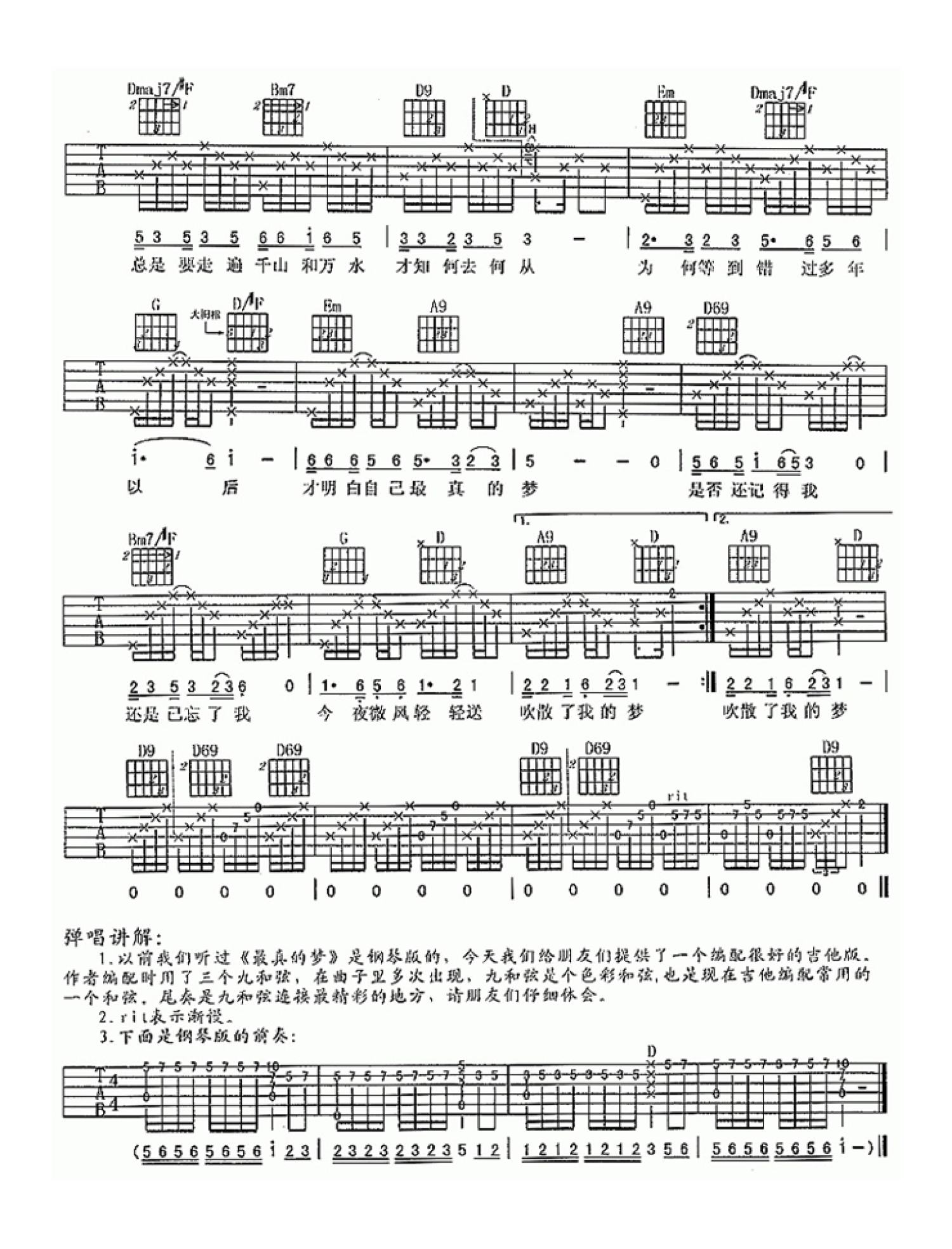 曲谱介绍: 曲谱采用了三个九和弦,九和弦是一个色彩和弦,在现在吉他编配中是比较常用的。尾奏是九和弦连接最精彩的部分,琴友们可以仔细体会。 最真的梦的粤语版是陈慧娴的人生何处不相逢。