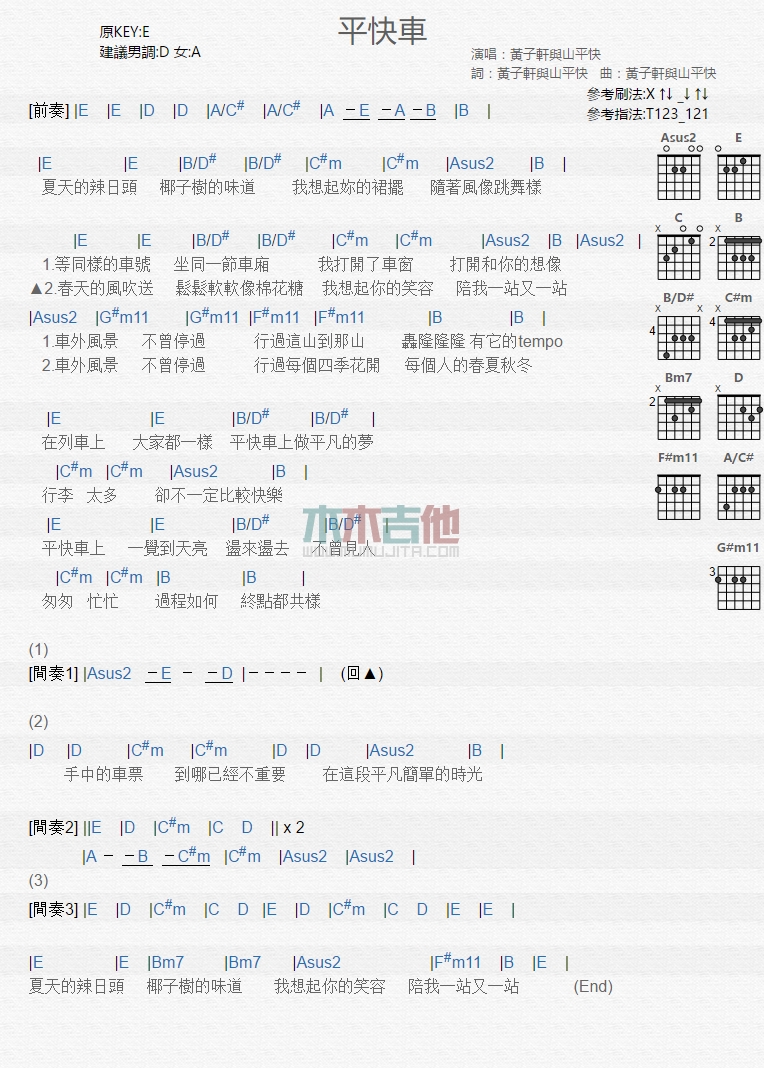 平快车吉他谱 - 黄子轩与山平快 - 吉他弹唱谱
