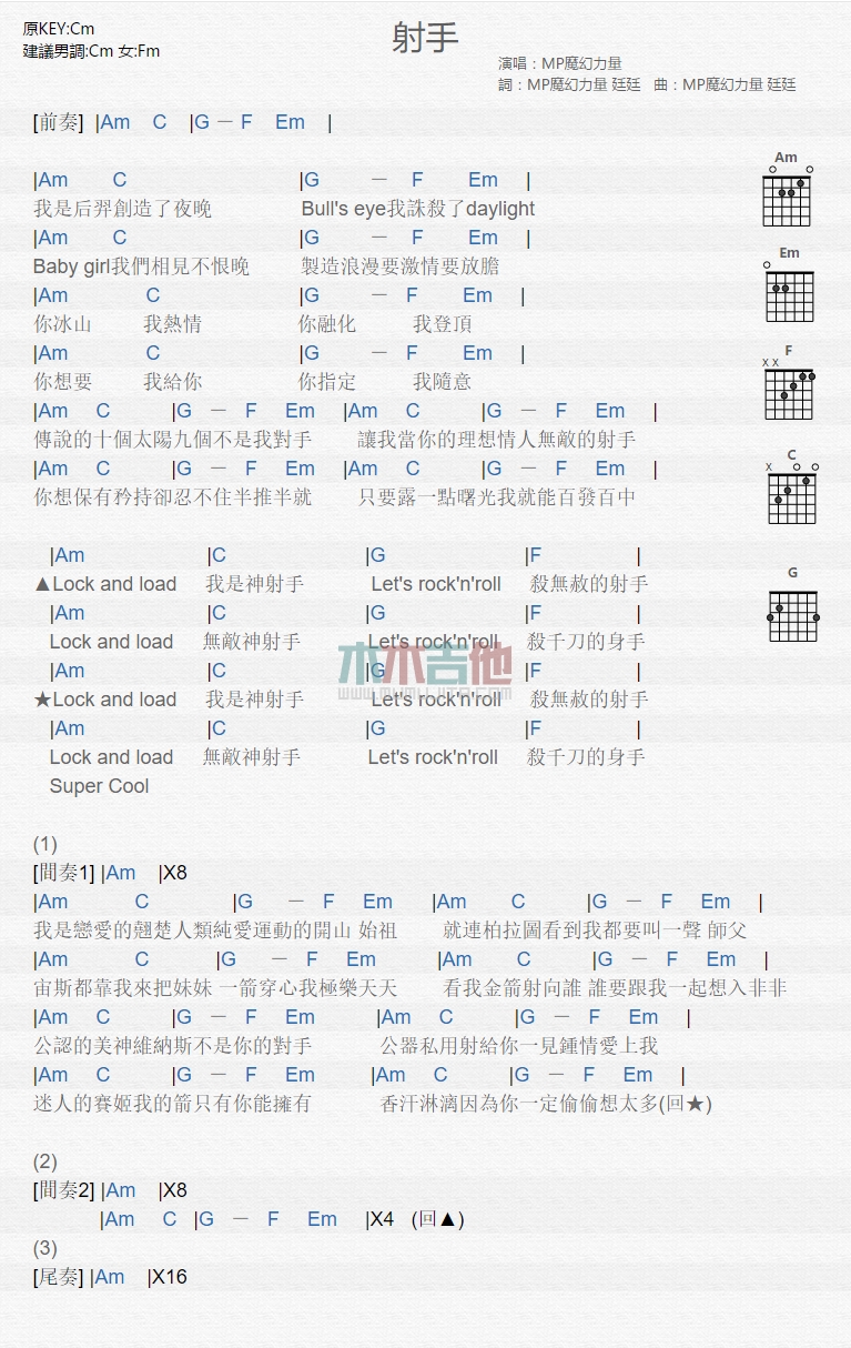曲谱介绍: MP魔幻力量《射手》吉他弹唱谱,共有1张高清图谱,免翻页排版设计。
