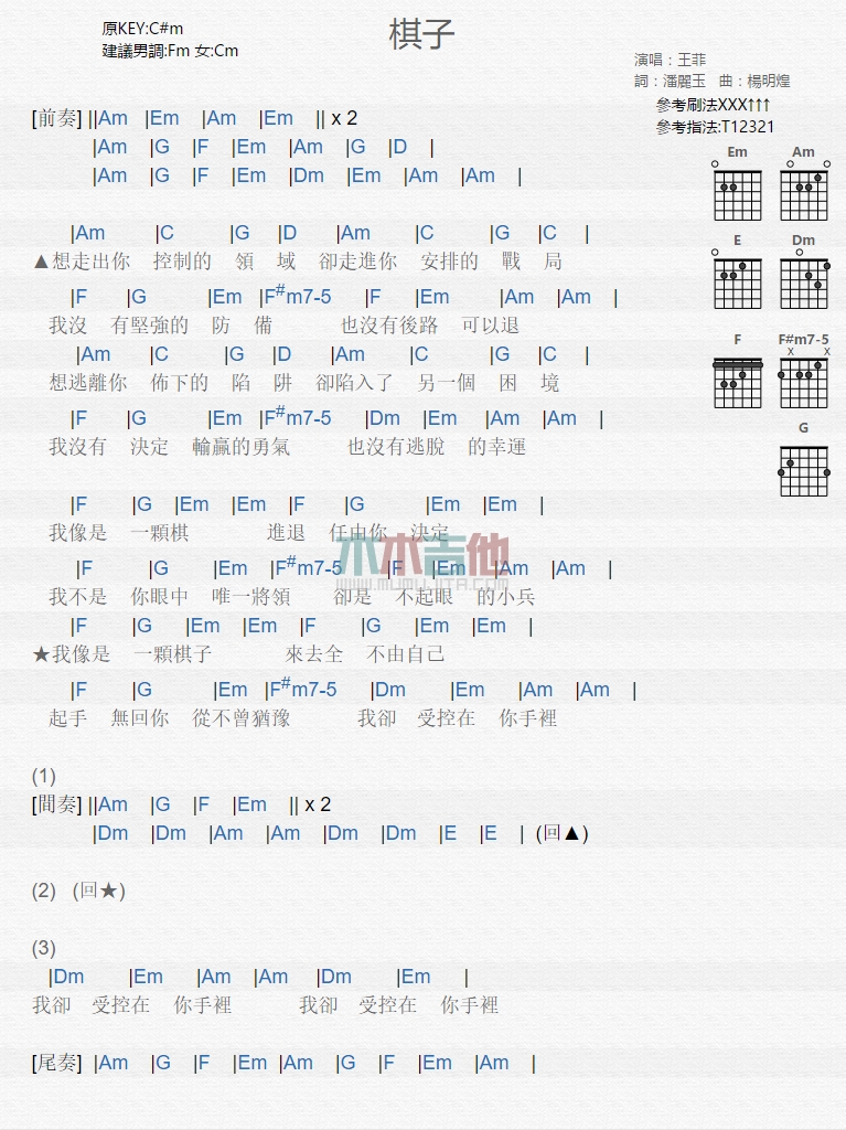曲谱介绍: 王菲《棋子》吉他弹唱谱,共有1张高清图谱,免翻页排版设计。