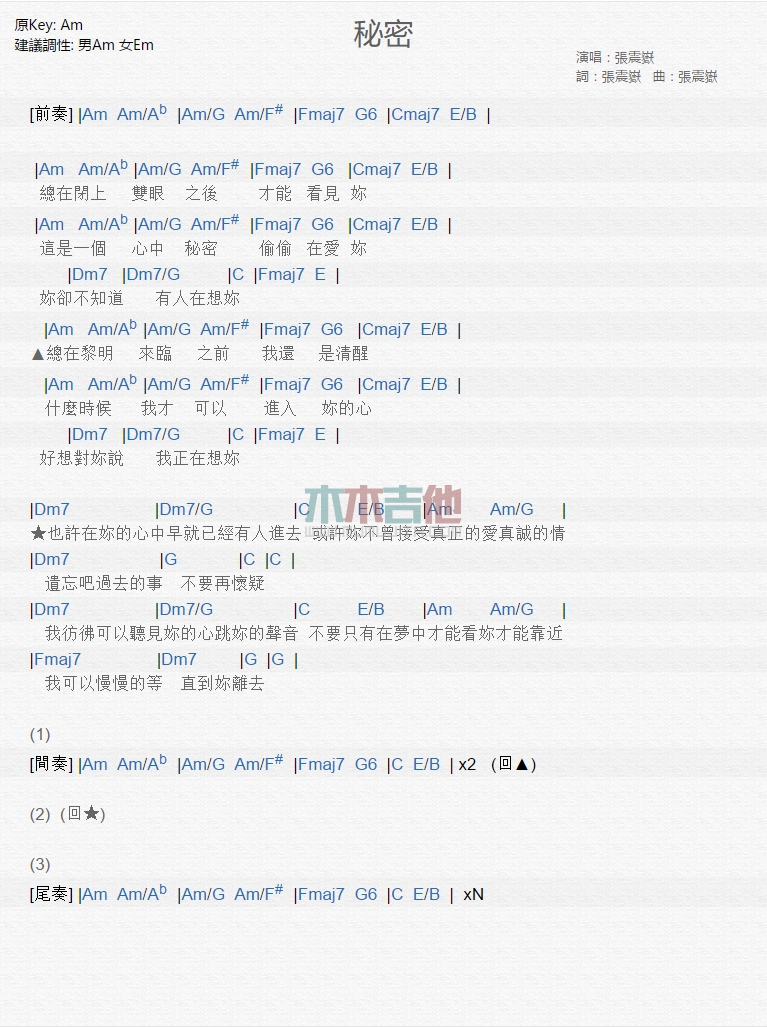 曲谱介绍: 张震岳《秘密》吉他弹唱谱,共有1张高清图谱,免翻页排版设计。